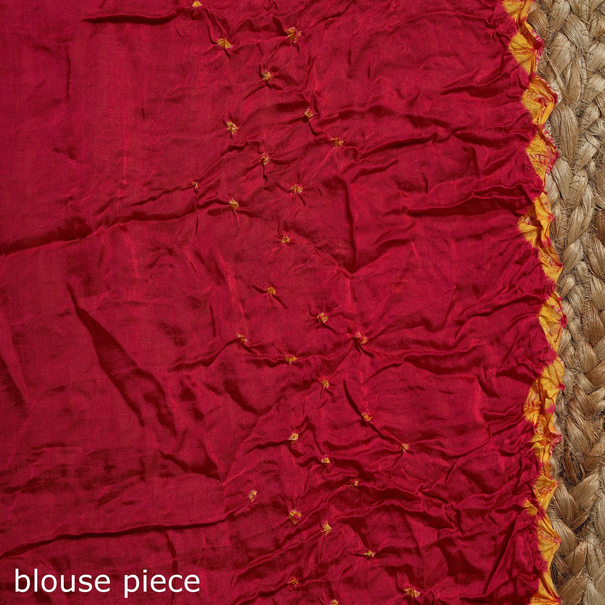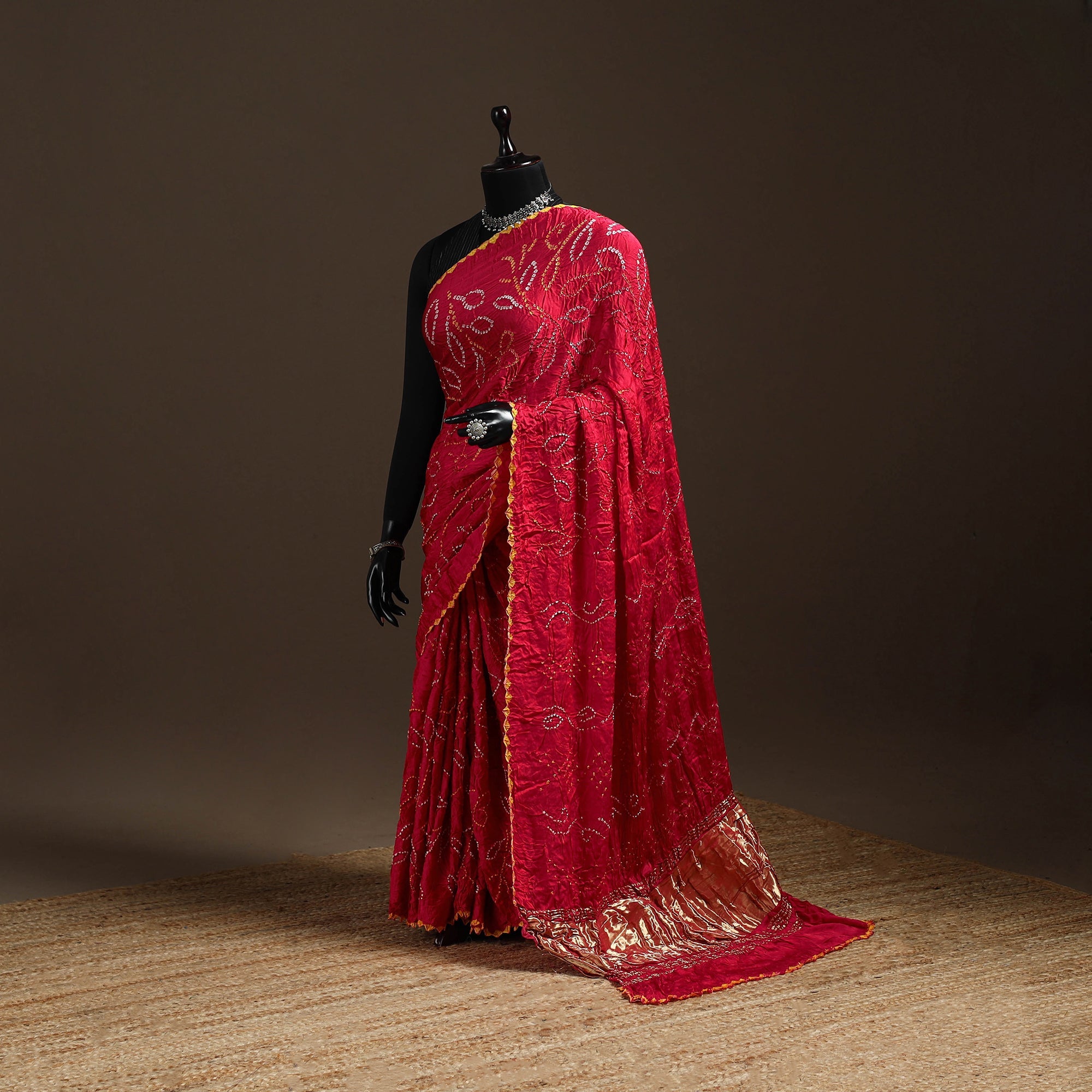 The art of bandhani with this pink kutch modal silk saree, hand-tie and dyed by skilled artisans.This saree features vibrant patterns and a luxurious zari border. Ideal for festive occasions, this piece reflects the timeless art of bandhani. Embrace cultural heritage with sustainable fashion.