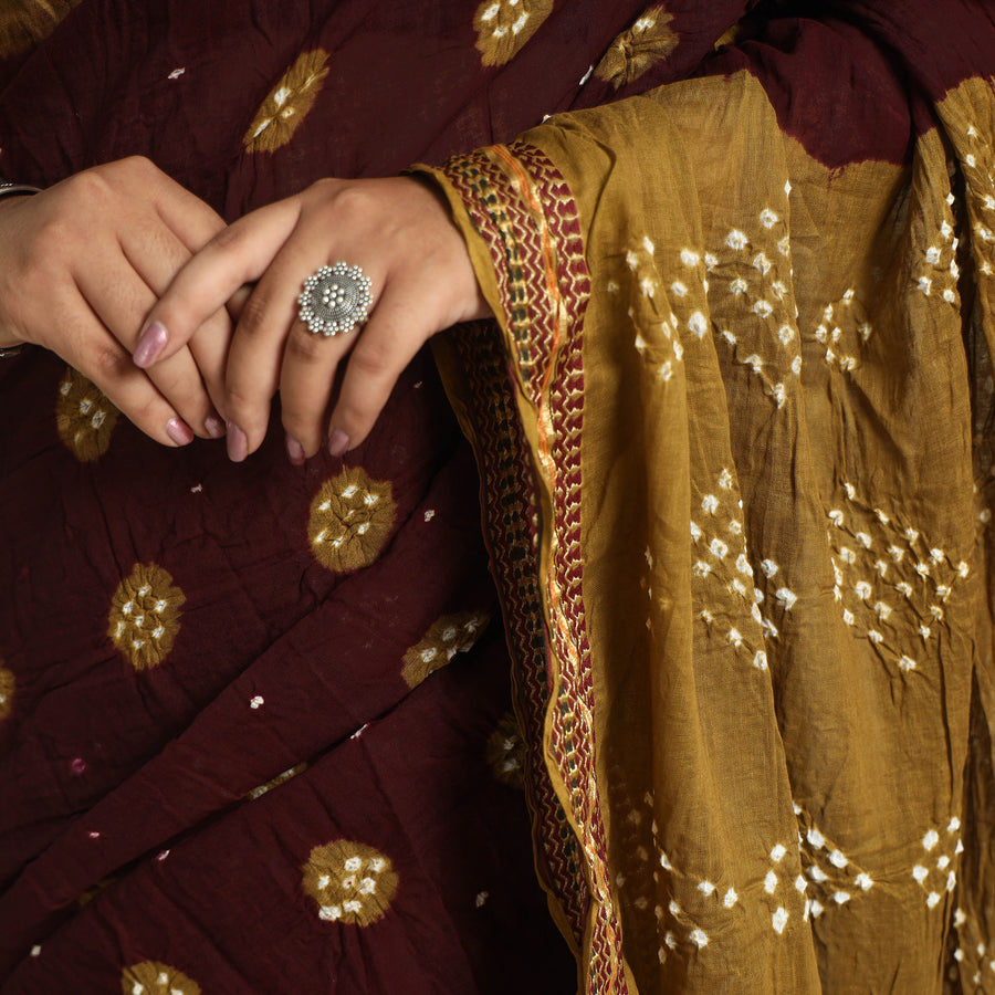 Bandhani originated around 5000 years ago making it one of the oldest crafts of Gujarat, that is still widely practiced as a famous tye-and-dye technique. The word `Bandhani` is derived from the word `Bandhan` which means tying up.