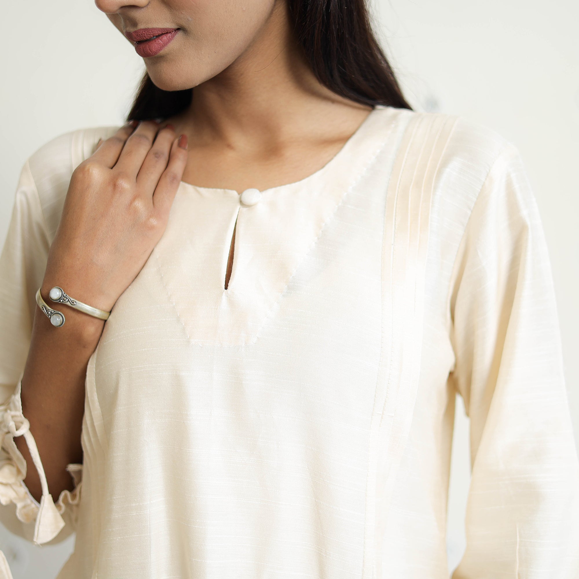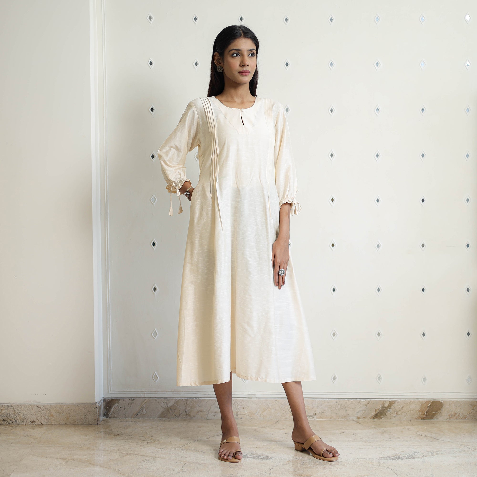 Step into effortless style with this elegant slub silk pintuck plain dress for women, featuring a handy side pocket for everyday convenience. Crafted from slub silk, this dress is perfect for casual wear or festive events, combining comfort and sophistication.