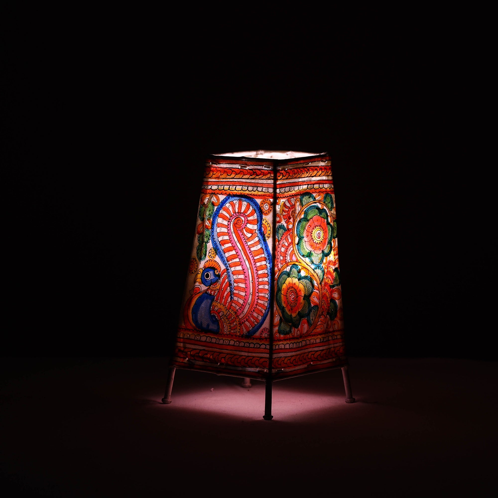 Add a cultural touch to your home with handmade Tholu Bommalata leather table lamp. Material used - leather, iron frame, natural colors, bulb holder with plug and wire.This traditional art form from Andhra Pradesh has a 2000-year history of storytelling through vibrant shadow puppetry. Each lamp is carefully handpainted on leather, showcasing intricate designs and vivid colors that glow like jewels when lit. A perfect blend of heritage and craftsmanship, this lamp makes a stunning decor piece.