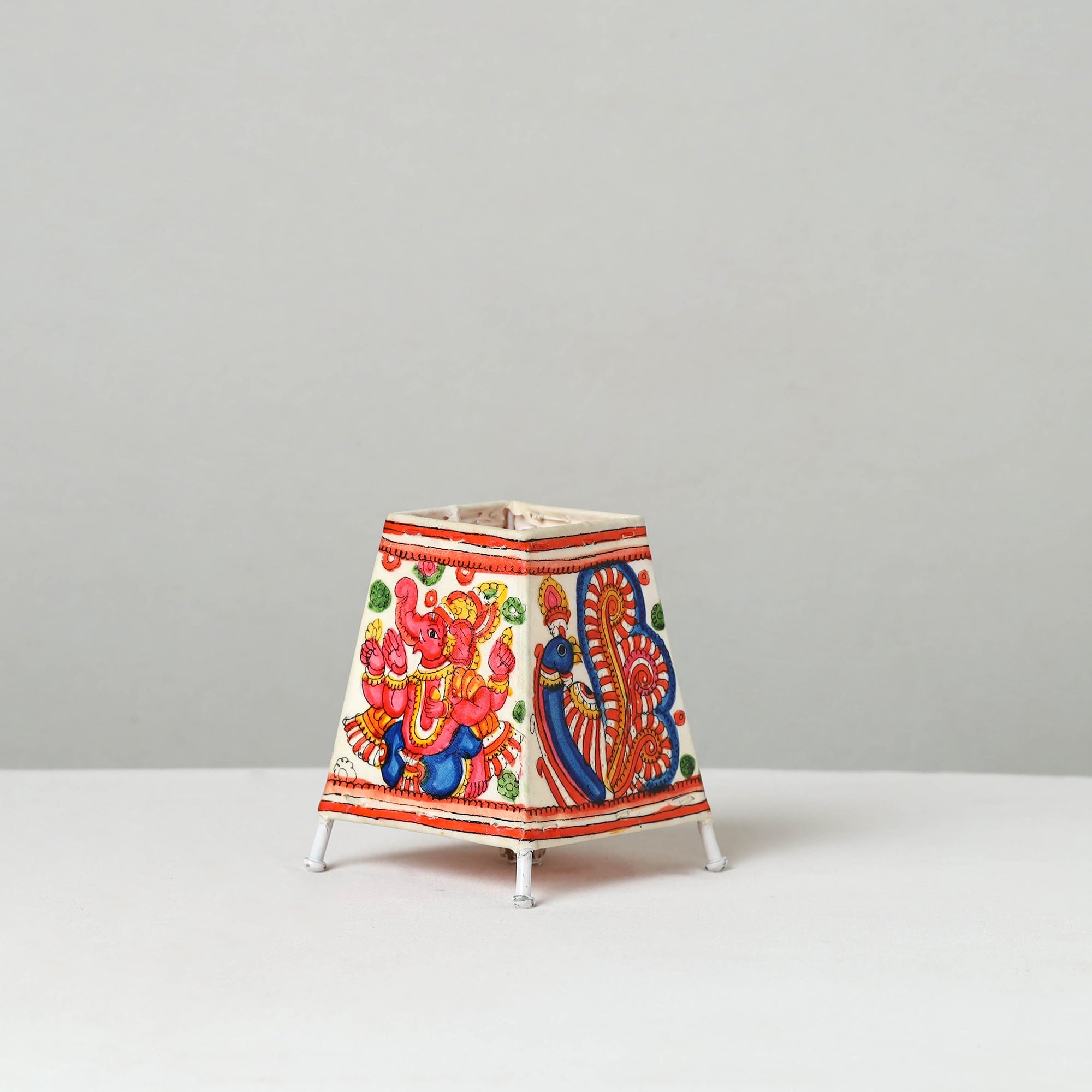 | Material | Add a cultural touch to your home with handmade Tholu Bommalata leather table lamp. Material used - leather, iron frame, natural colors, bulb holder with plug and wire.This traditional art form from Andhra Pradesh has a 2000-year history of storytelling through vibrant shadow puppetry. Each lamp is carefully handpainted on leather, showcasing intricate designs and vivid colors that glow like jewels when lit. A perfect blend of heritage and craftsmanship, this lamp makes a stunning decor piece. |