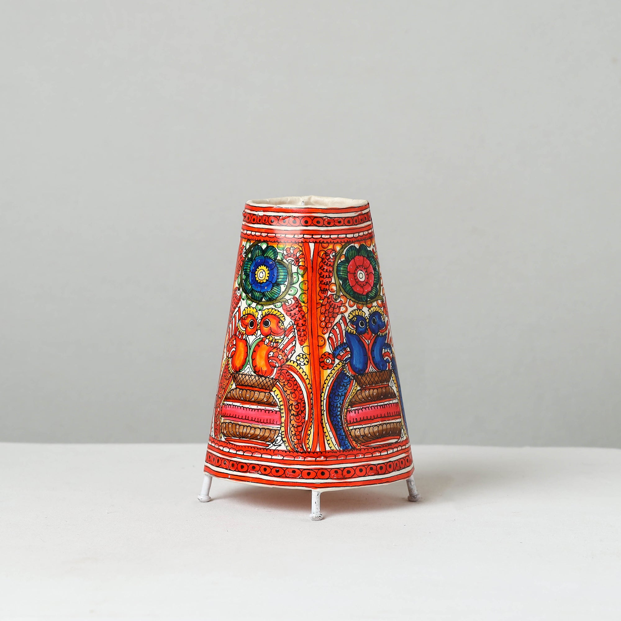 Add a cultural touch to your home with handmade Tholu Bommalata leather table lamp. Material used - leather, iron frame, natural colors, bulb holder with plug and wire.This traditional art form from Andhra Pradesh has a 2000-year history of storytelling through vibrant shadow puppetry. Each lamp is carefully handpainted on leather, showcasing intricate designs and vivid colors that glow like jewels when lit. A perfect blend of heritage and craftsmanship, this lamp makes a stunning decor piece.