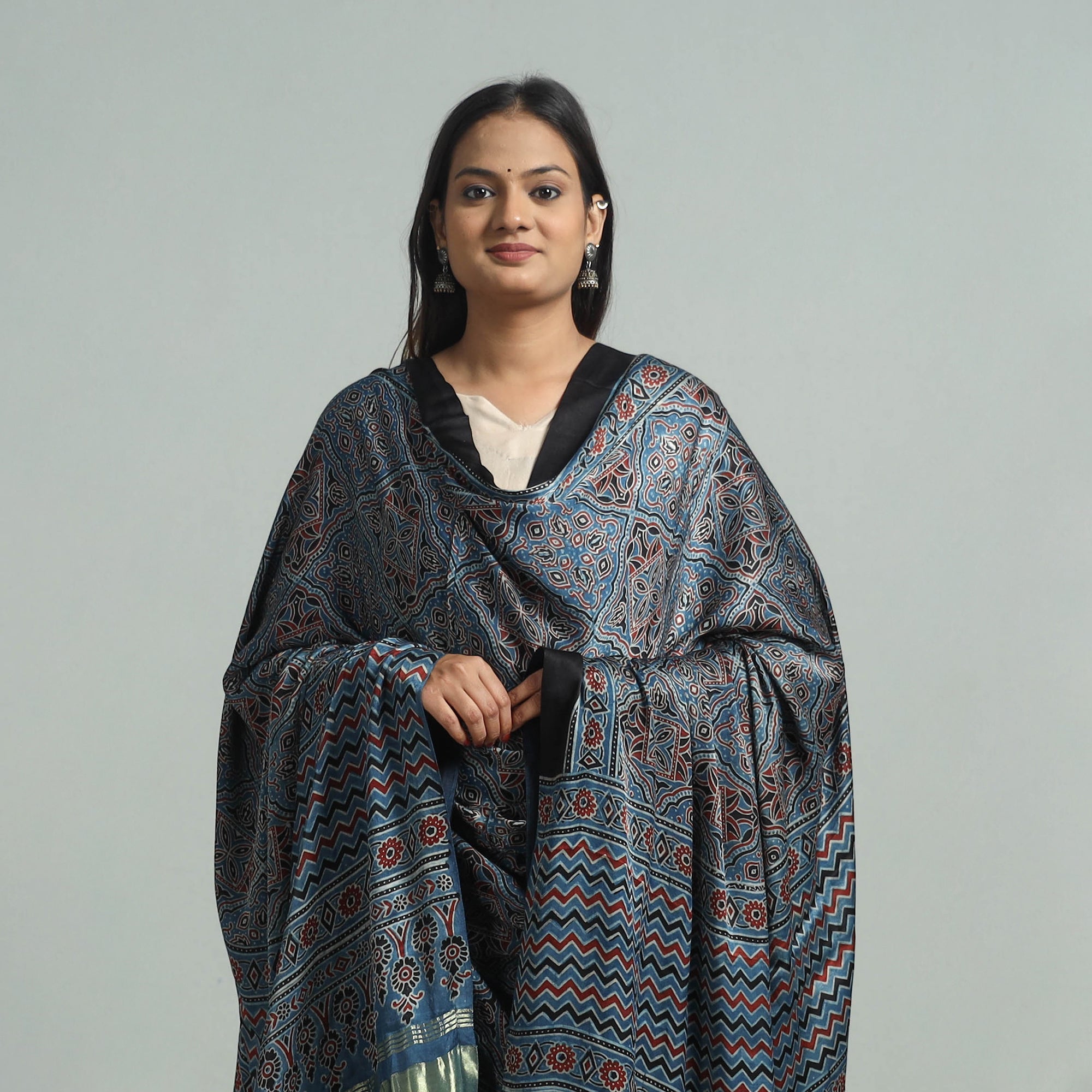 Elevate your style with our blue ajrakh modal silk dupatta, handcrafted in Gujarat using traditional ajrakh techniques. The modal silk fabric is adorned with exquisite hand block prints and a rich zari border, making it a versatile choice for any occasion. Each dupatta reflects India’s rich cultural heritage, using natural dyes for an eco-friendly finish.