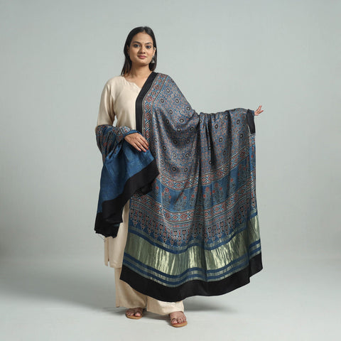 | Material | Elevate your style with our blue ajrakh modal silk dupatta, handcrafted in Gujarat using traditional ajrakh techniques. The modal silk fabric is adorned with exquisite hand block prints and a rich zari border, making it a versatile choice for any occasion. Each dupatta reflects India’s rich cultural heritage, using natural dyes for an eco-friendly finish. |
