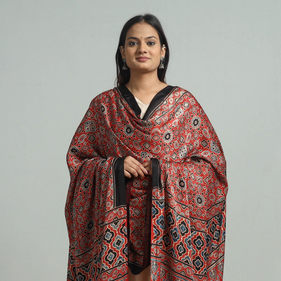 Elevate your style with our red ajrakh modal silk dupatta, handcrafted in Gujarat using traditional ajrakh techniques. The modal silk fabric is adorned with exquisite hand block prints and a rich zari border, making it a versatile choice for any occasion. Each dupatta reflects India’s rich cultural heritage, using natural dyes for an eco-friendly finish.