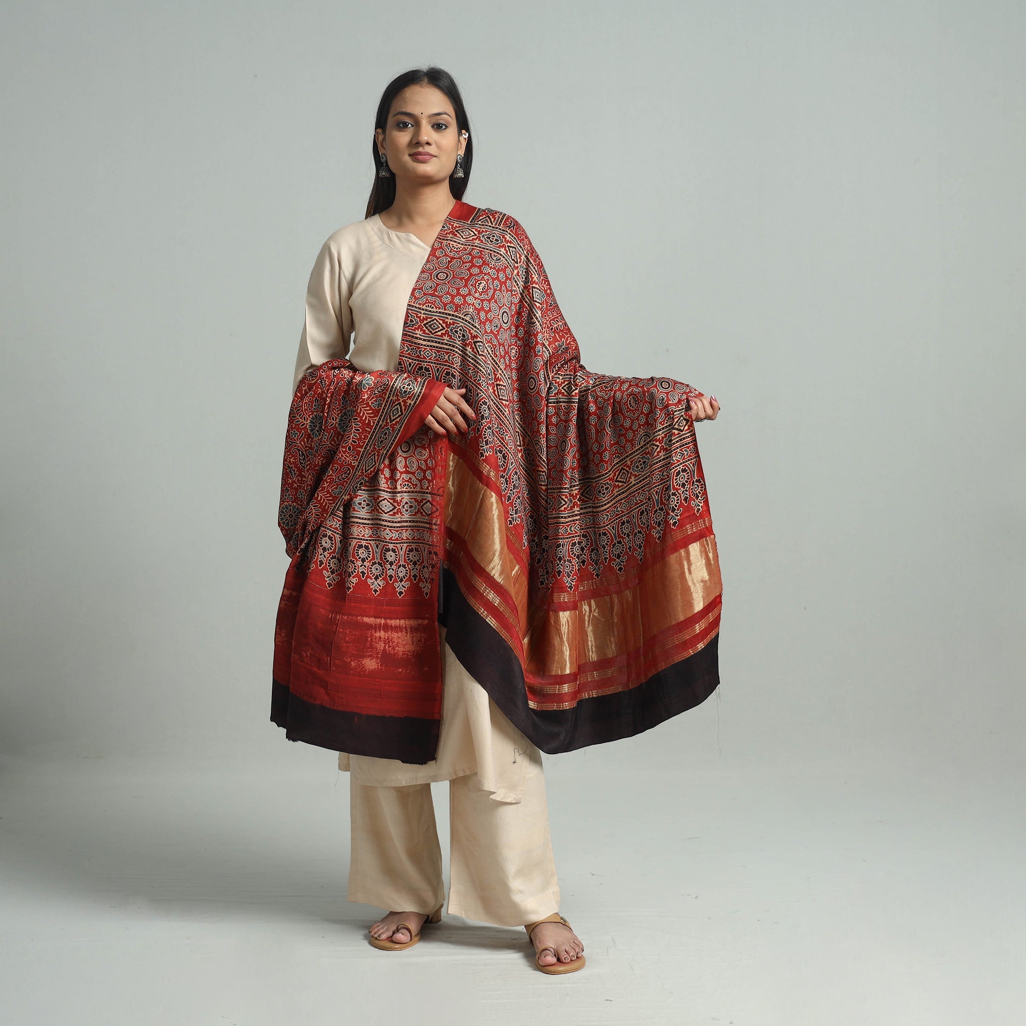 Elevate your style with our red ajrakh modal silk dupatta, handcrafted in Gujarat using traditional ajrakh techniques. The modal silk fabric is adorned with exquisite hand block prints and a rich zari border, making it a versatile choice for any occasion. Each dupatta reflects India’s rich cultural heritage, using natural dyes for an eco-friendly finish.