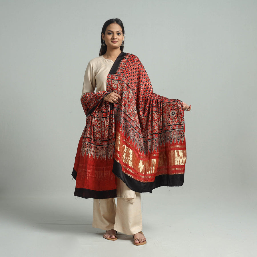 Elevate your style with our red ajrakh modal silk dupatta, handcrafted in Gujarat using traditional ajrakh techniques. The modal silk fabric is adorned with exquisite hand block prints and a rich zari border, making it a versatile choice for any occasion. Each dupatta reflects India’s rich cultural heritage, using natural dyes for an eco-friendly finish.