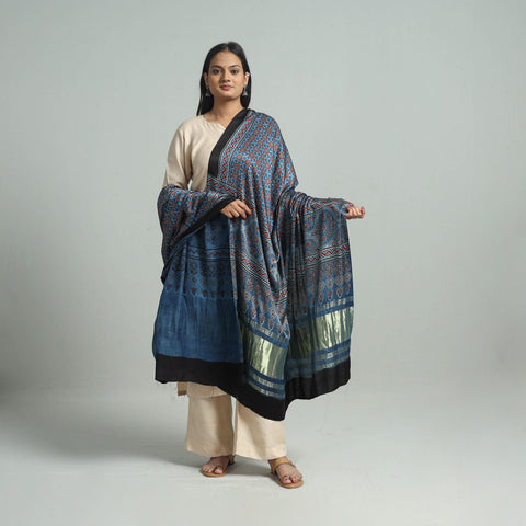 Elevate your style with our blue ajrakh modal silk dupatta, handcrafted in Gujarat using traditional ajrakh techniques. The modal silk fabric is adorned with exquisite hand block prints and a rich zari border, making it a versatile choice for any occasion. Each dupatta reflects India’s rich cultural heritage, using natural dyes for an eco-friendly finish.