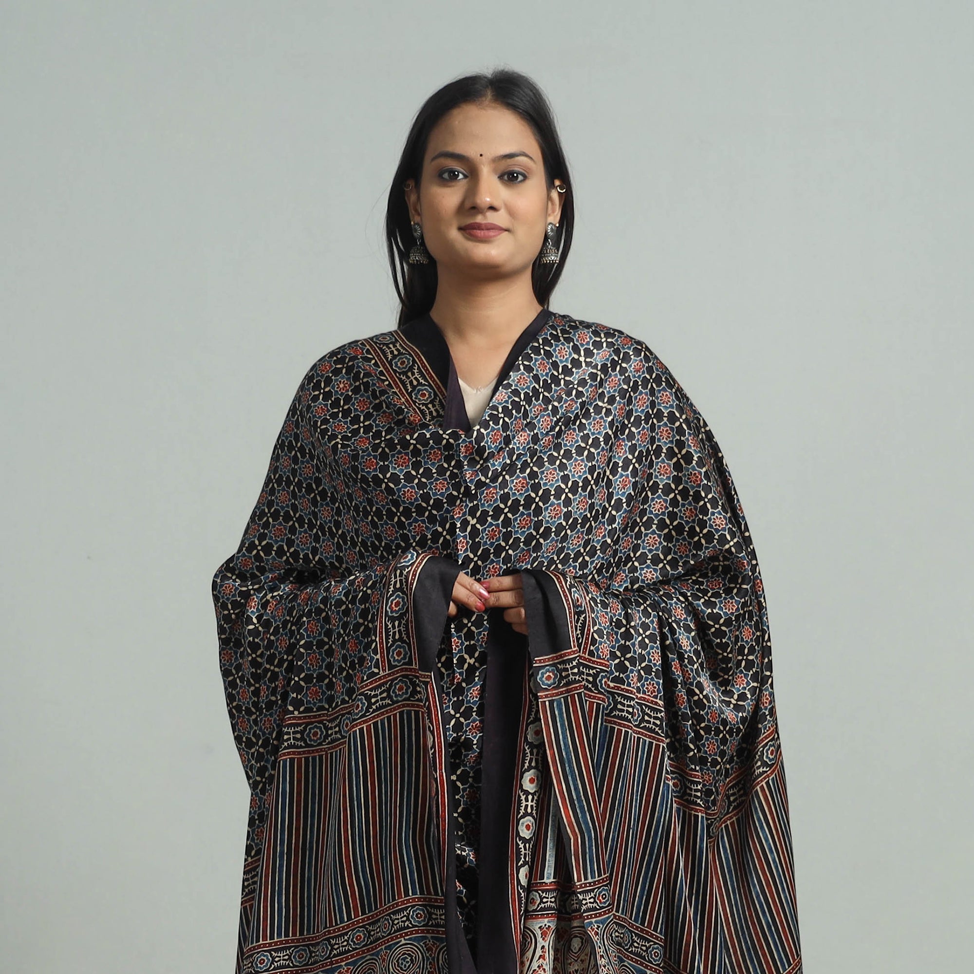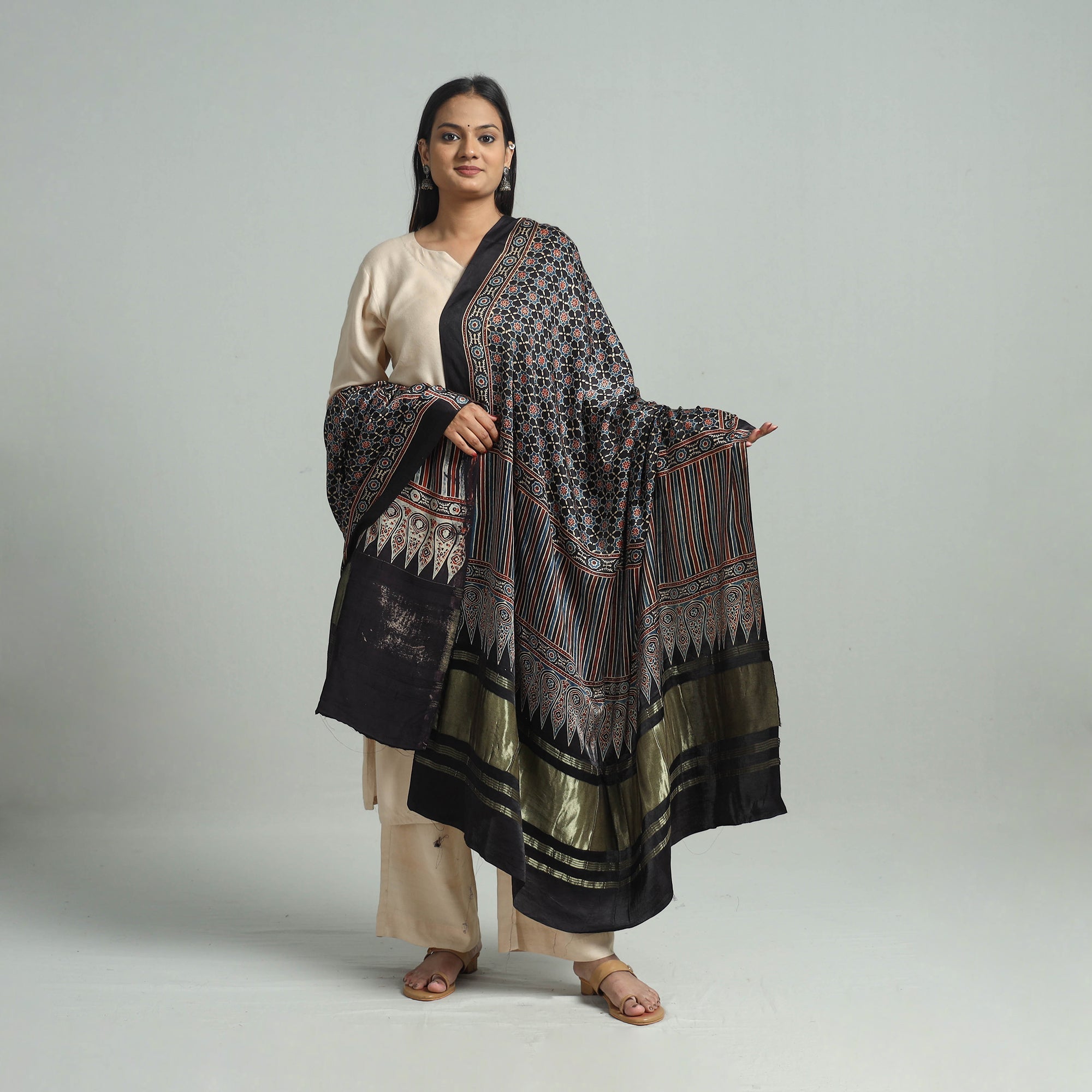 Elevate your style with our black ajrakh modal silk dupatta, handcrafted in Gujarat using traditional ajrakh techniques. The modal silk fabric is adorned with exquisite hand block prints and a rich zari border, making it a versatile choice for any occasion. Each dupatta reflects India’s rich cultural heritage, using natural dyes for an eco-friendly finish.