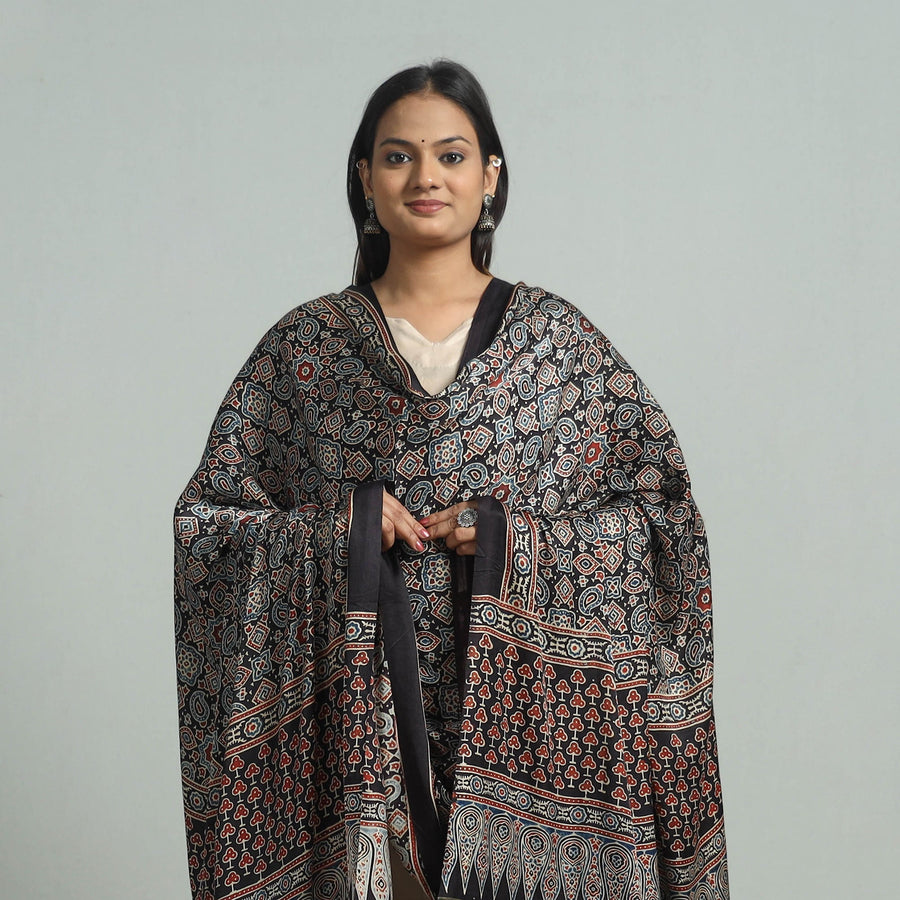 Elevate your style with our black ajrakh modal silk dupatta, handcrafted in Gujarat using traditional ajrakh techniques. The modal silk fabric is adorned with exquisite hand block prints and a rich zari border, making it a versatile choice for any occasion. Each dupatta reflects India’s rich cultural heritage, using natural dyes for an eco-friendly finish.