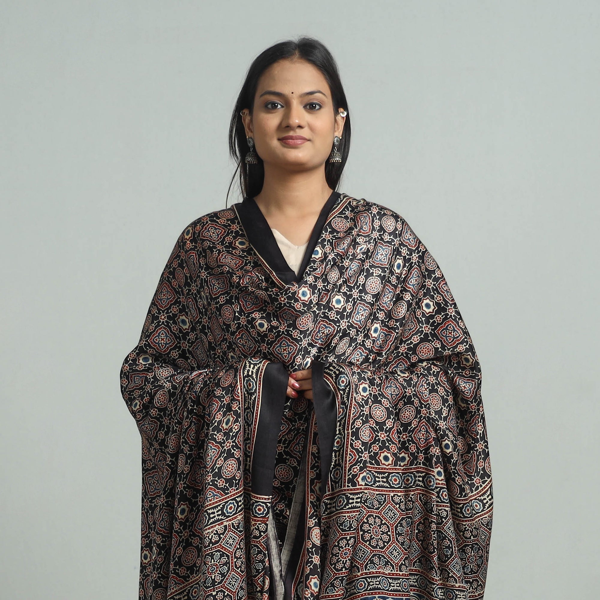 Elevate your style with our black ajrakh modal silk dupatta, handcrafted in Gujarat using traditional ajrakh techniques. The modal silk fabric is adorned with exquisite hand block prints and a rich zari border, making it a versatile choice for any occasion. Each dupatta reflects India’s rich cultural heritage, using natural dyes for an eco-friendly finish.