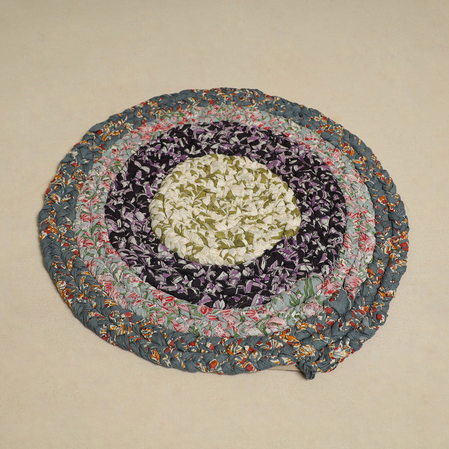 Add a touch of tradition to your home with this beautiful gudri hand-braided door mat. Made from upcycled cotton fabrics, it reflects the rich heritage of Indian craftsmanship, especially the Gudri technique known for its intricate hand-stitching. this door mat is durable and soft underfoot.