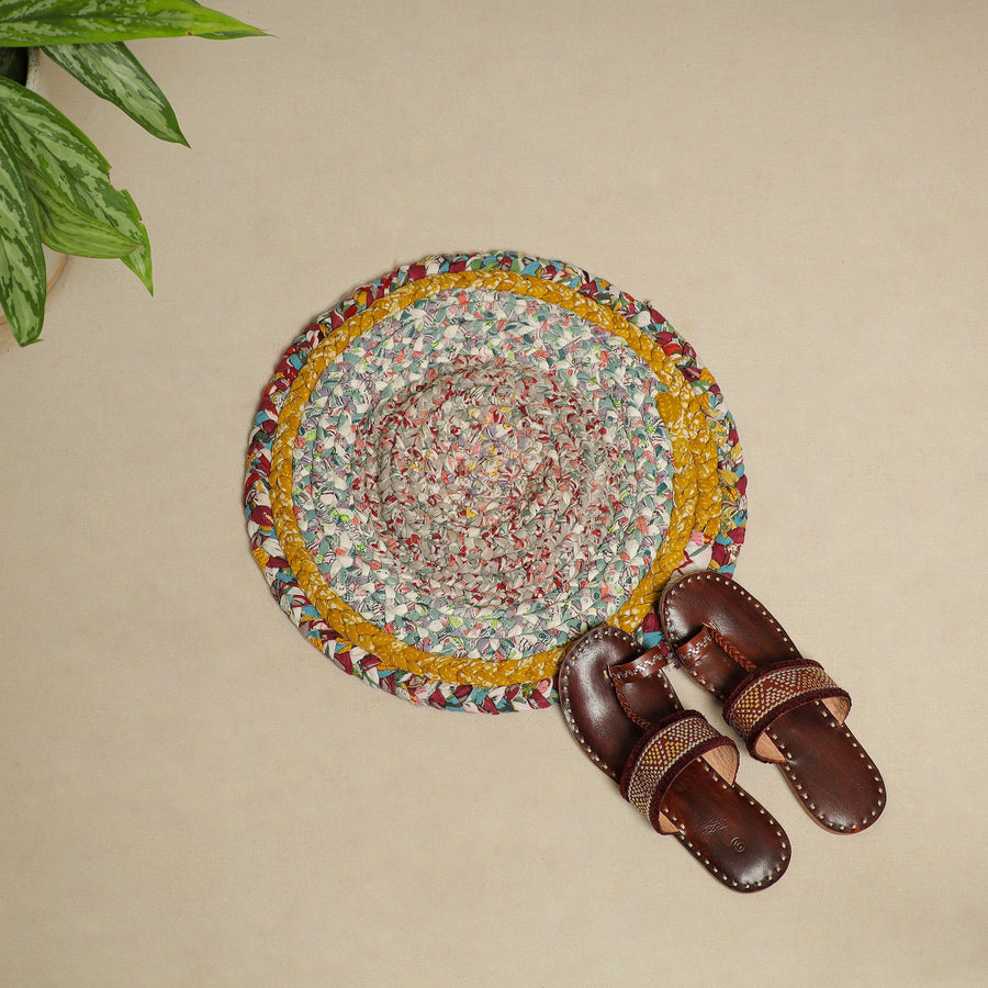 Add a touch of tradition to your home with this beautiful gudri hand-braided door mat. Made from upcycled cotton fabrics, it reflects the rich heritage of Indian craftsmanship, especially the Gudri technique known for its intricate hand-stitching. this door mat is durable and soft underfoot.