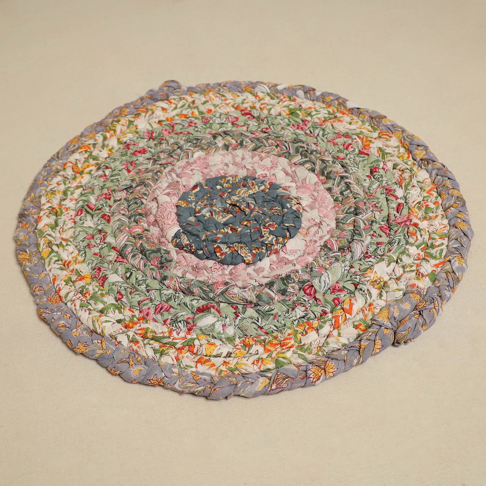 Add a touch of tradition to your home with this beautiful gudri hand-braided door mat. Made from upcycled cotton fabrics, it reflects the rich heritage of Indian craftsmanship, especially the Gudri technique known for its intricate hand-stitching. this door mat is durable and soft underfoot.