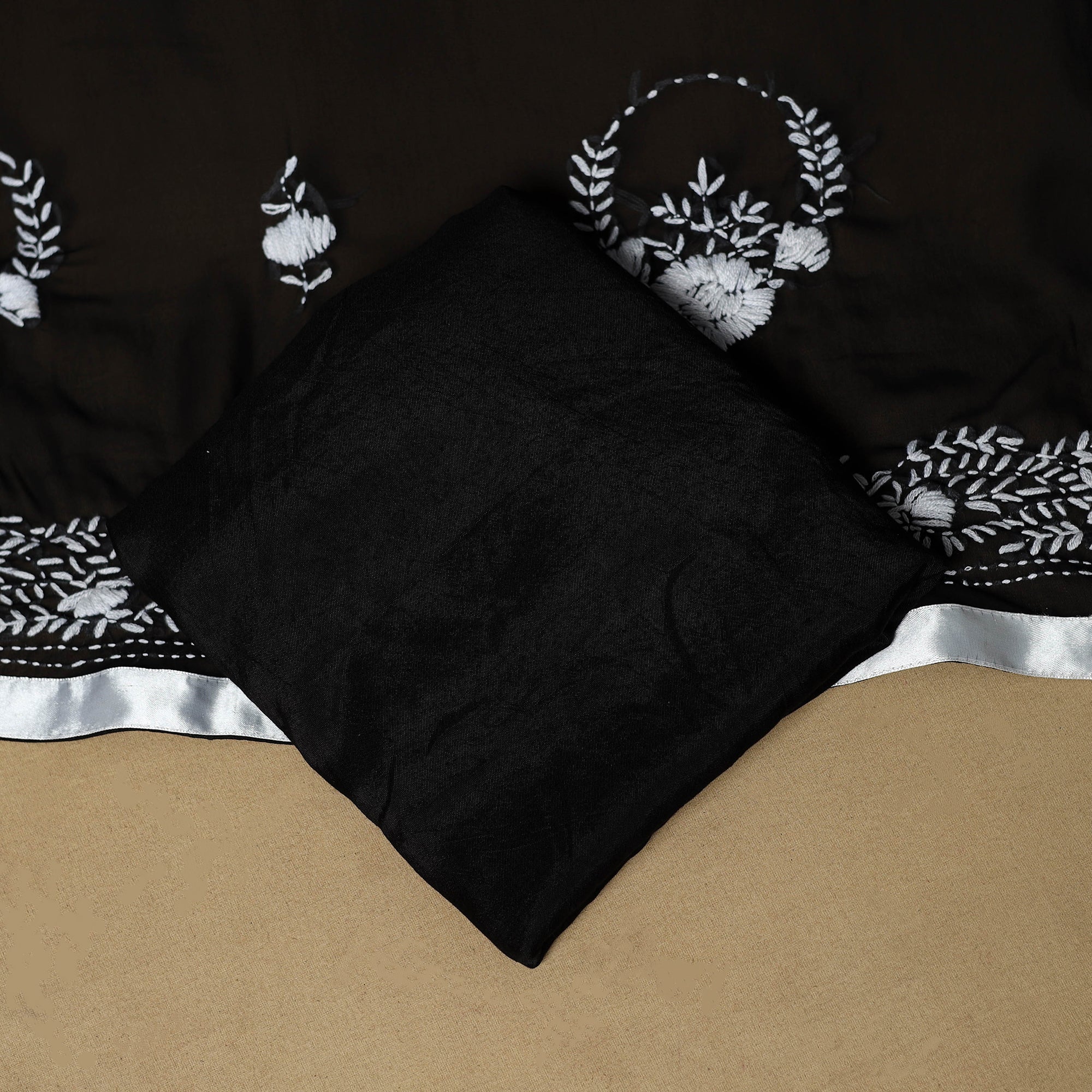 Indulge in the beauty of chapa work phulkari embroidery with this georgette 3-piece suit material set with plain santoon (viscose-cotton) bottom material. Phulkari, meaning "flower" and "kari," meaning craft, is a traditional embroidery art from Punjab, India. It uses floral motifs and is done with woolen threads. This suit material set allows you to unleash your creativity and create a unique outfit that reflects the rich tradition of Phulkari embroidery. Ideal for festive and ethnic wear.