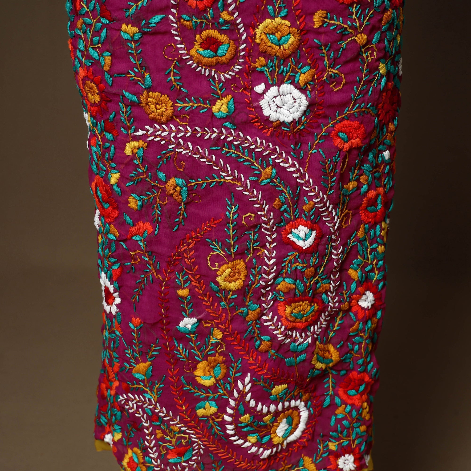 Indulge in the beauty of chapa work phulkari embroidery with this georgette 3-piece suit material set with plain santoon (viscose-cotton) bottom material. Phulkari, meaning "flower" and "kari," meaning craft, is a traditional embroidery art from Punjab, India. It uses floral motifs and is done with woolen threads. This suit material set allows you to unleash your creativity and create a unique outfit that reflects the rich tradition of Phulkari embroidery. Ideal for festive and ethnic wear.