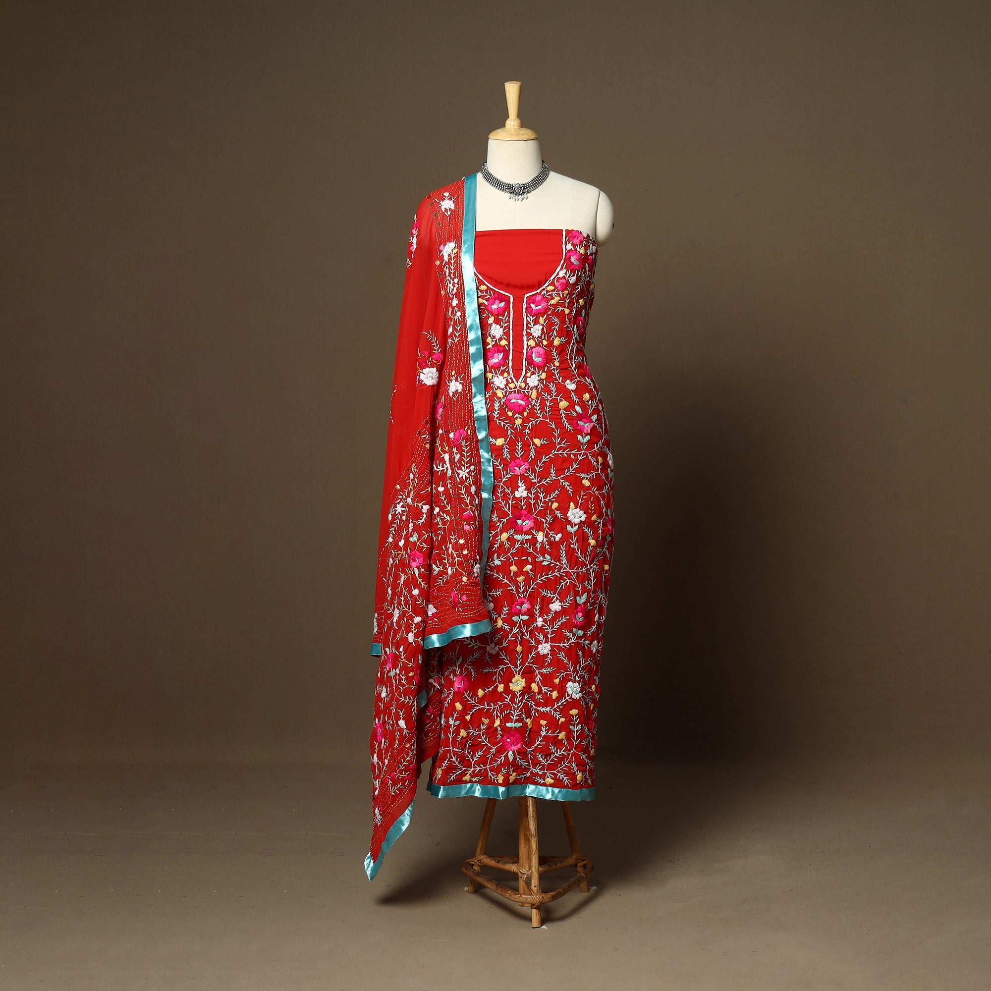 Red - 3pc Hand Embroidery Georgette Unstitched Phulkari Dress Material 22