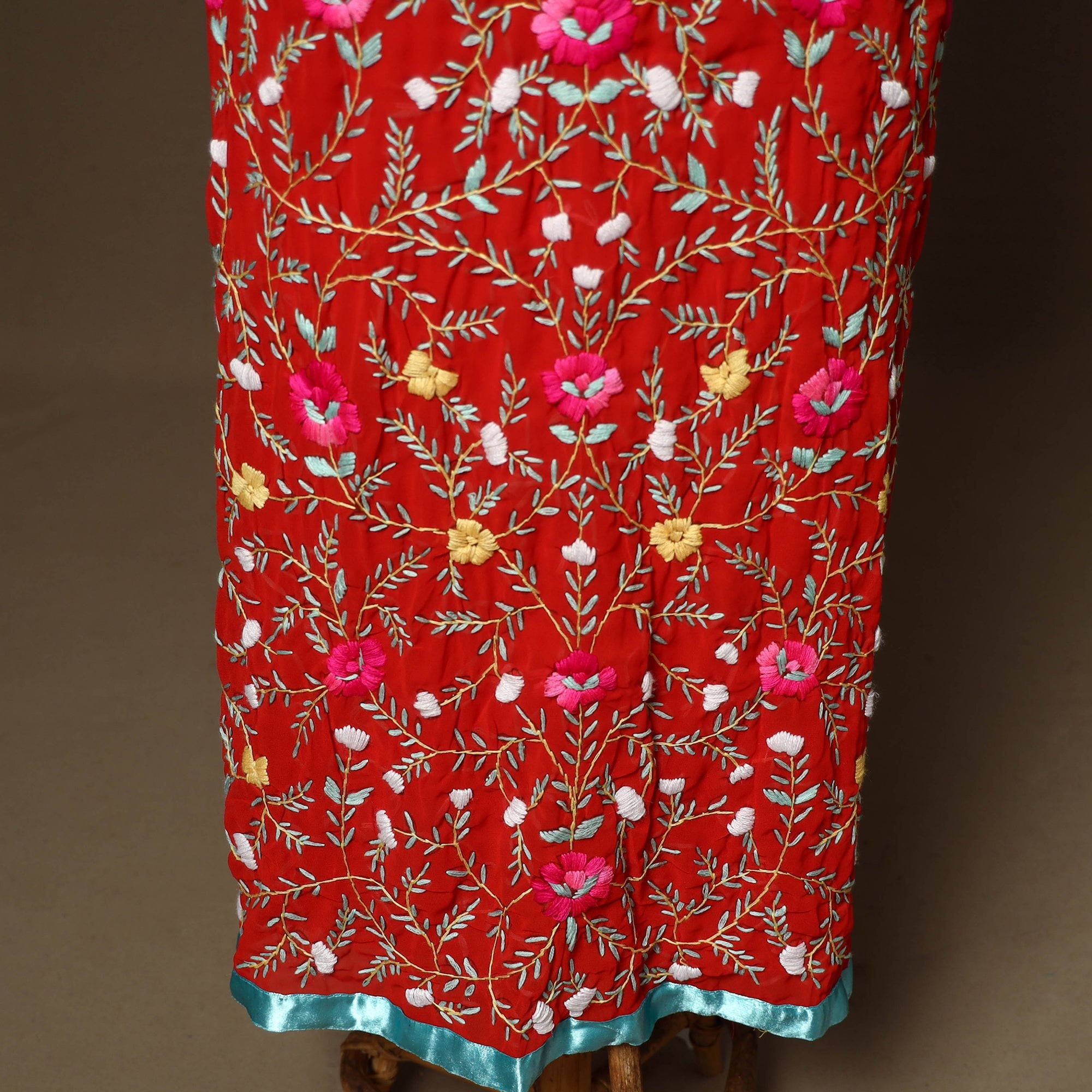 Indulge in the beauty of chapa work phulkari embroidery with this georgette 3-piece suit material set with plain santoon (viscose-cotton) bottom material. Phulkari, meaning "flower" and "kari," meaning craft, is a traditional embroidery art from Punjab, India. It uses floral motifs and is done with woolen threads. This suit material set allows you to unleash your creativity and create a unique outfit that reflects the rich tradition of Phulkari embroidery. Ideal for festive and ethnic wear.