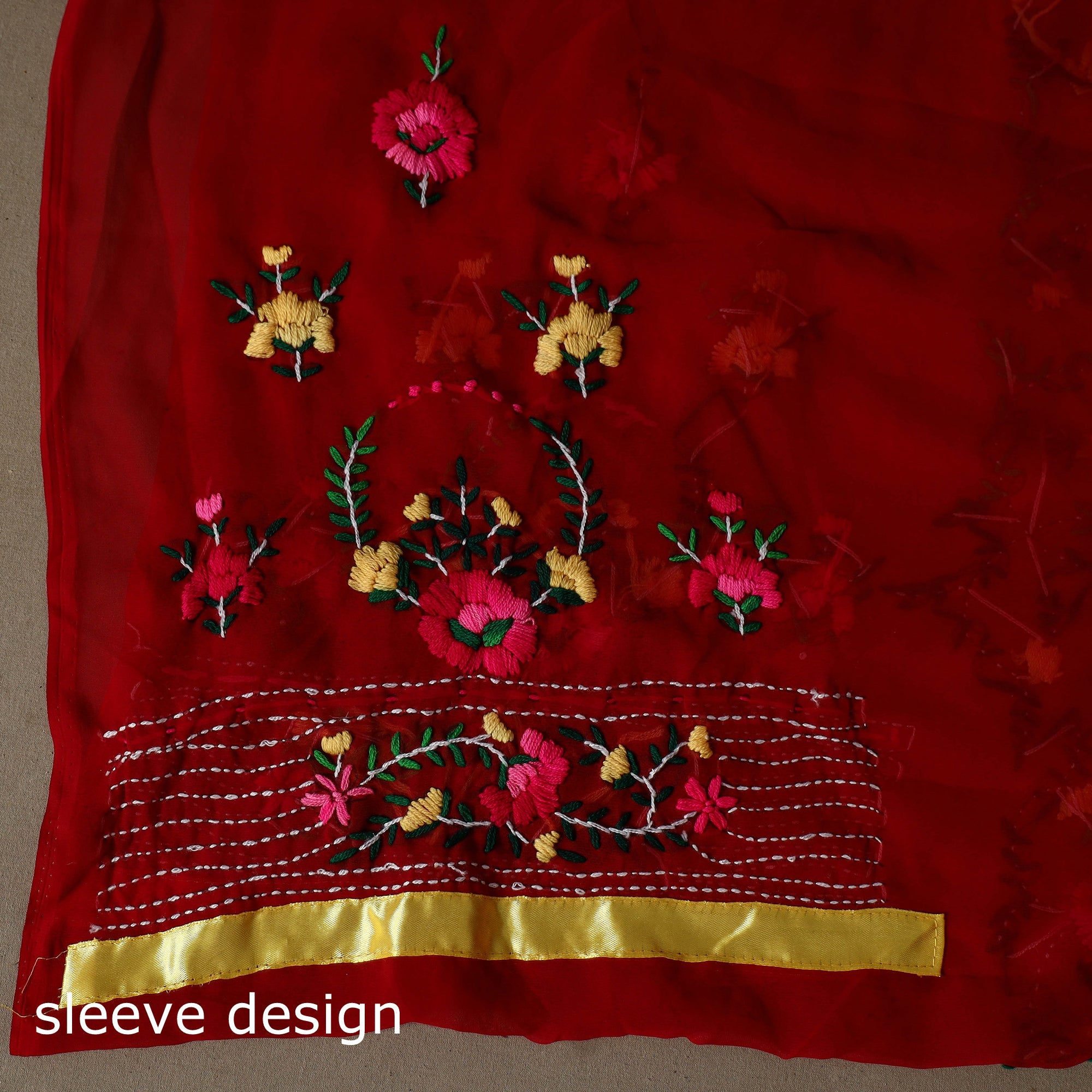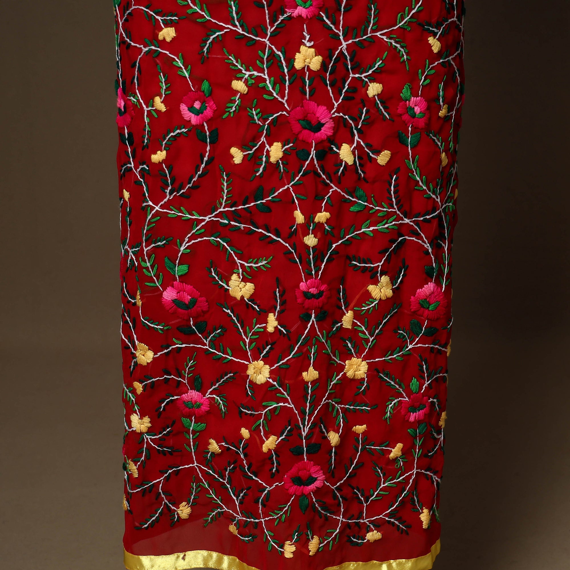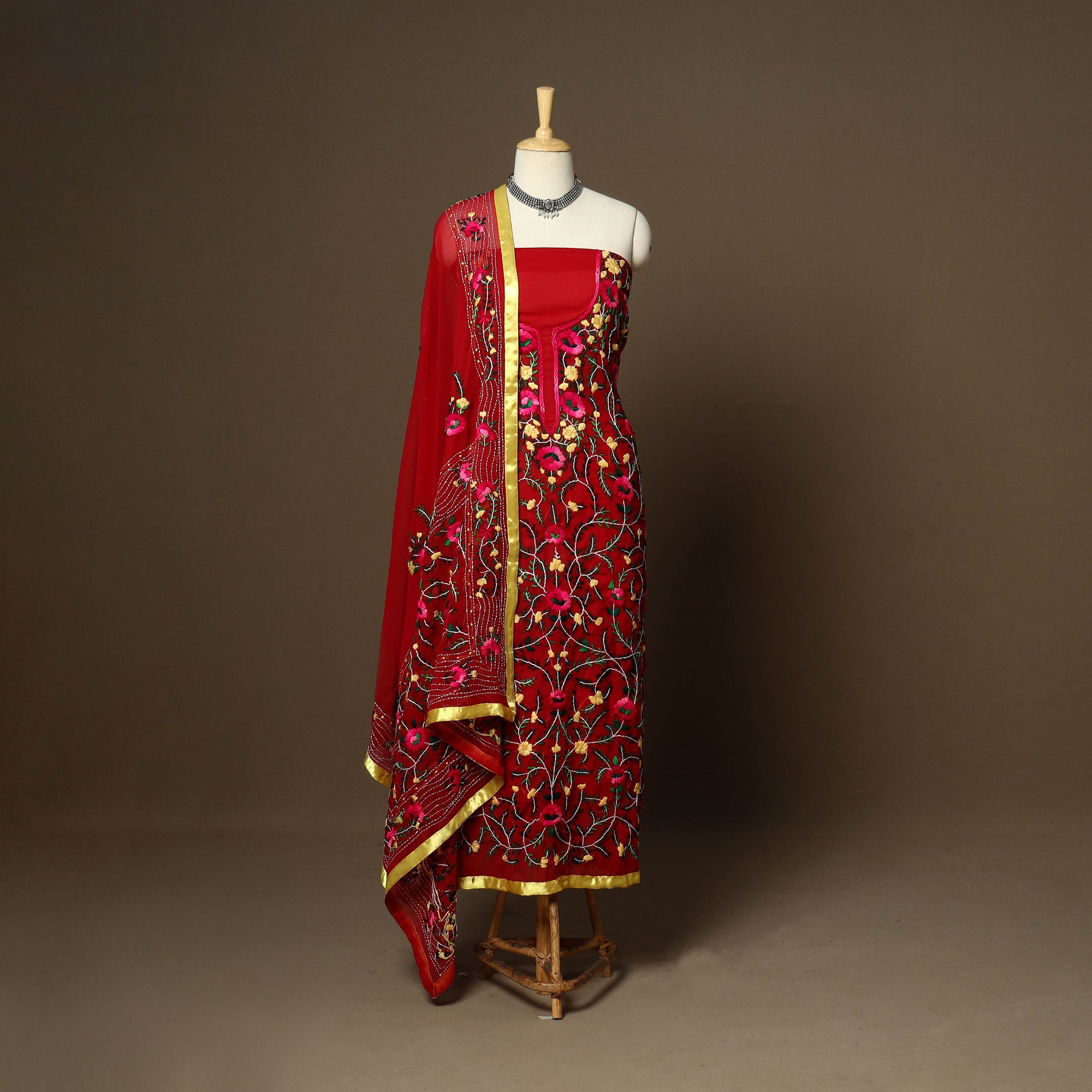 Indulge in the beauty of chapa work phulkari embroidery with this georgette 3-piece suit material set with plain santoon (viscose-cotton) bottom material. Phulkari, meaning "flower" and "kari," meaning craft, is a traditional embroidery art from Punjab, India. It uses floral motifs and is done with woolen threads. This suit material set allows you to unleash your creativity and create a unique outfit that reflects the rich tradition of Phulkari embroidery. Ideal for festive and ethnic wear.
