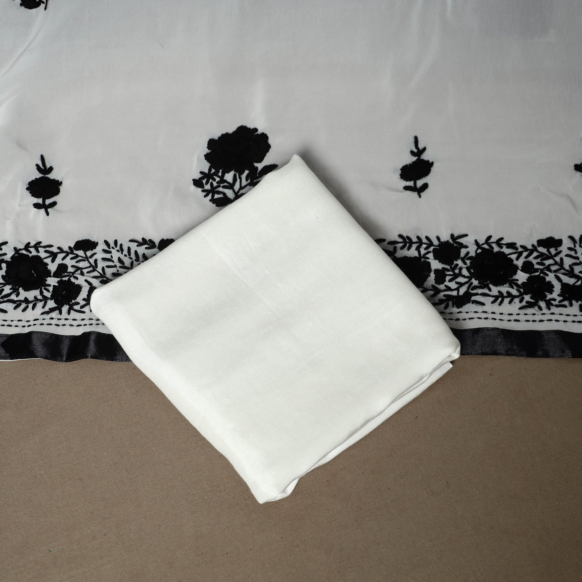 Indulge in the beauty of chapa work phulkari embroidery with this georgette 3-piece suit material set with plain santoon (viscose-cotton) bottom material. Phulkari, meaning "flower" and "kari," meaning craft, is a traditional embroidery art from Punjab, India. It uses floral motifs and is done with woolen threads. This suit material set allows you to unleash your creativity and create a unique outfit that reflects the rich tradition of Phulkari embroidery. Ideal for festive and ethnic wear.