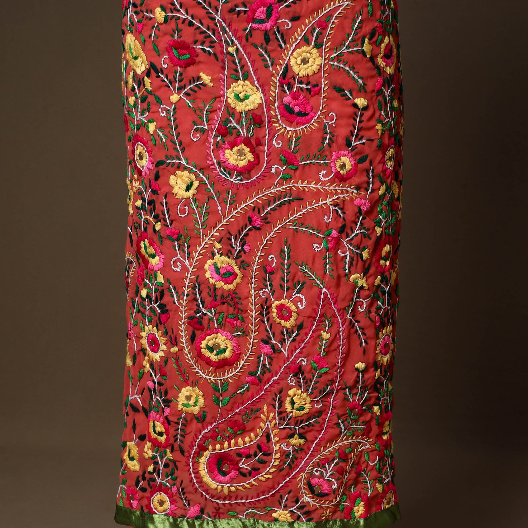 Indulge in the beauty of chapa work phulkari embroidery with this georgette 3-piece suit material set with plain santoon (viscose-cotton) bottom material. Phulkari, meaning "flower" and "kari," meaning craft, is a traditional embroidery art from Punjab, India. It uses floral motifs and is done with woolen threads. This suit material set allows you to unleash your creativity and create a unique outfit that reflects the rich tradition of Phulkari embroidery. Ideal for festive and ethnic wear.