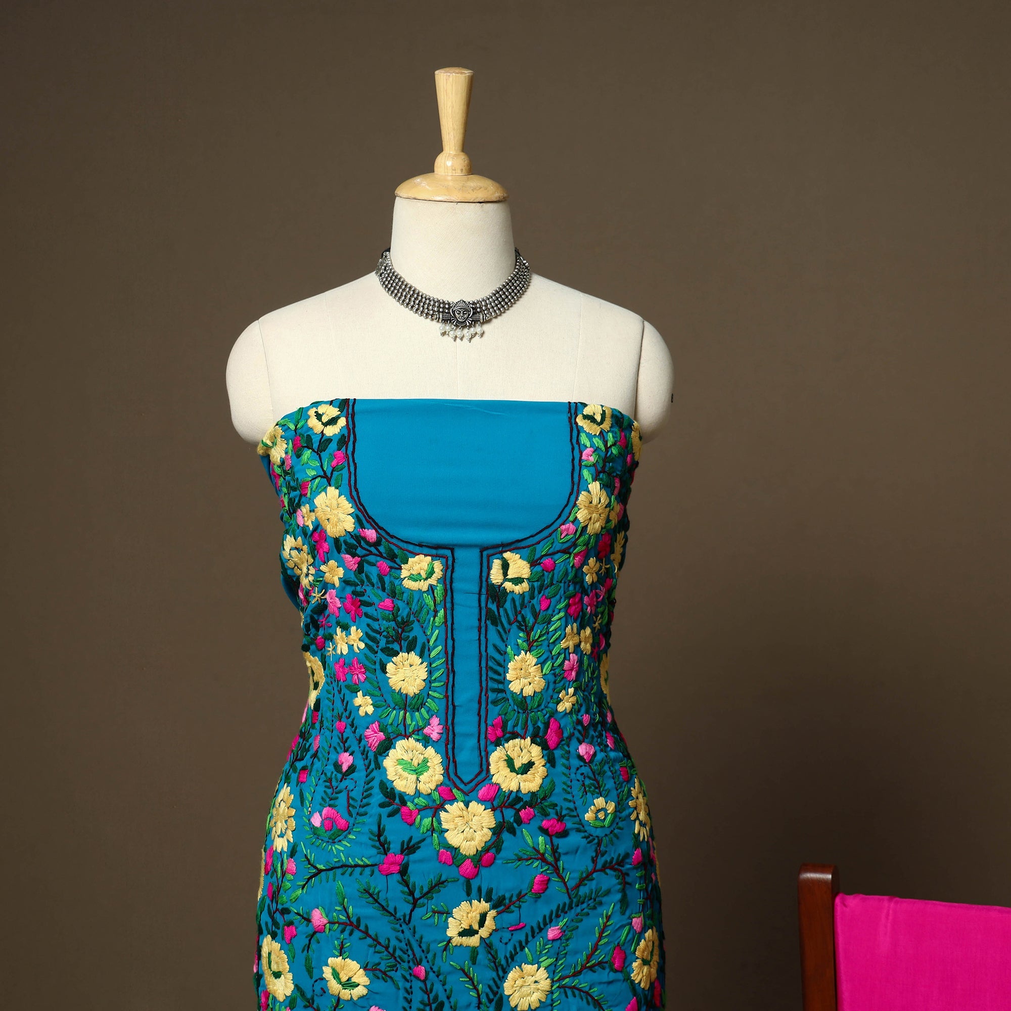 Indulge in the beauty of chapa work phulkari embroidery with this georgette 3-piece suit material set with plain santoon (viscose-cotton) bottom material. Phulkari, meaning "flower" and "kari," meaning craft, is a traditional embroidery art from Punjab, India. It uses floral motifs and is done with woolen threads. This suit material set allows you to unleash your creativity and create a unique outfit that reflects the rich tradition of Phulkari embroidery. Ideal for festive and ethnic wear.
