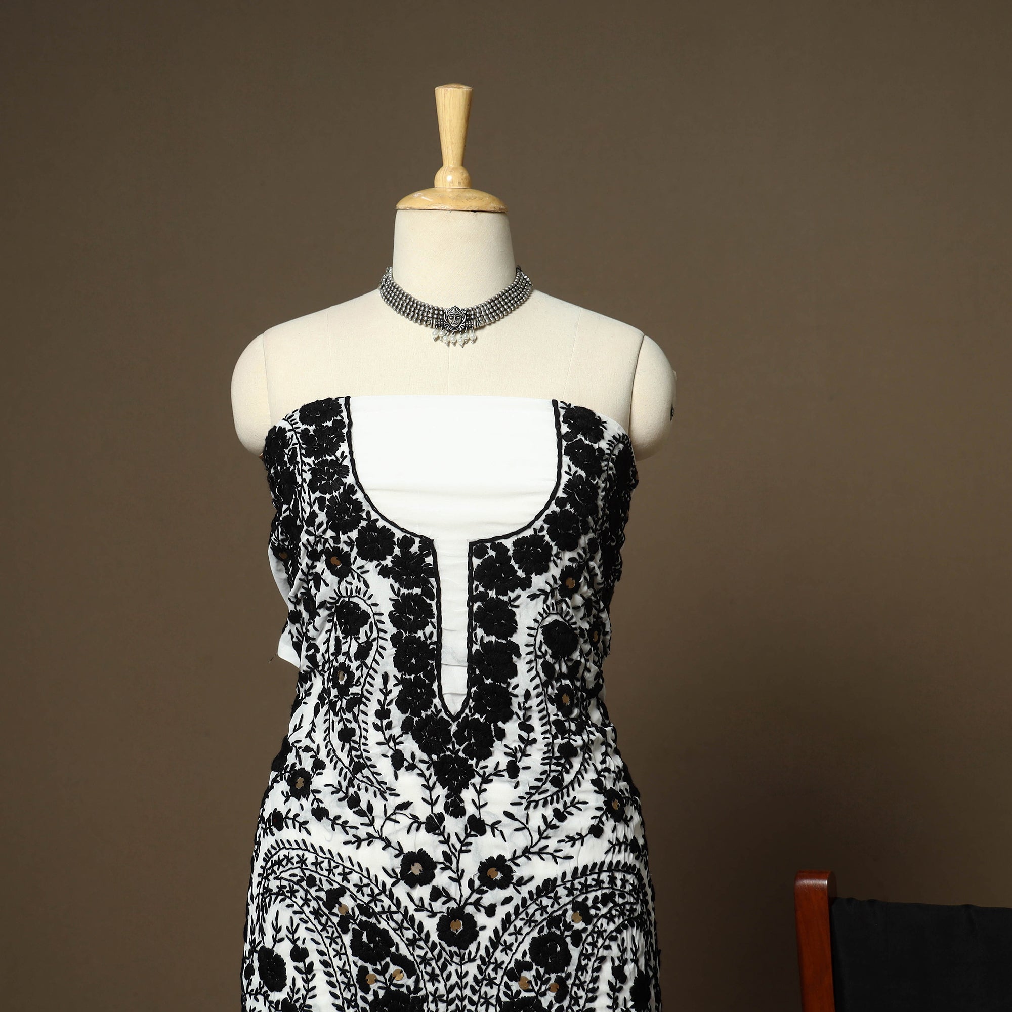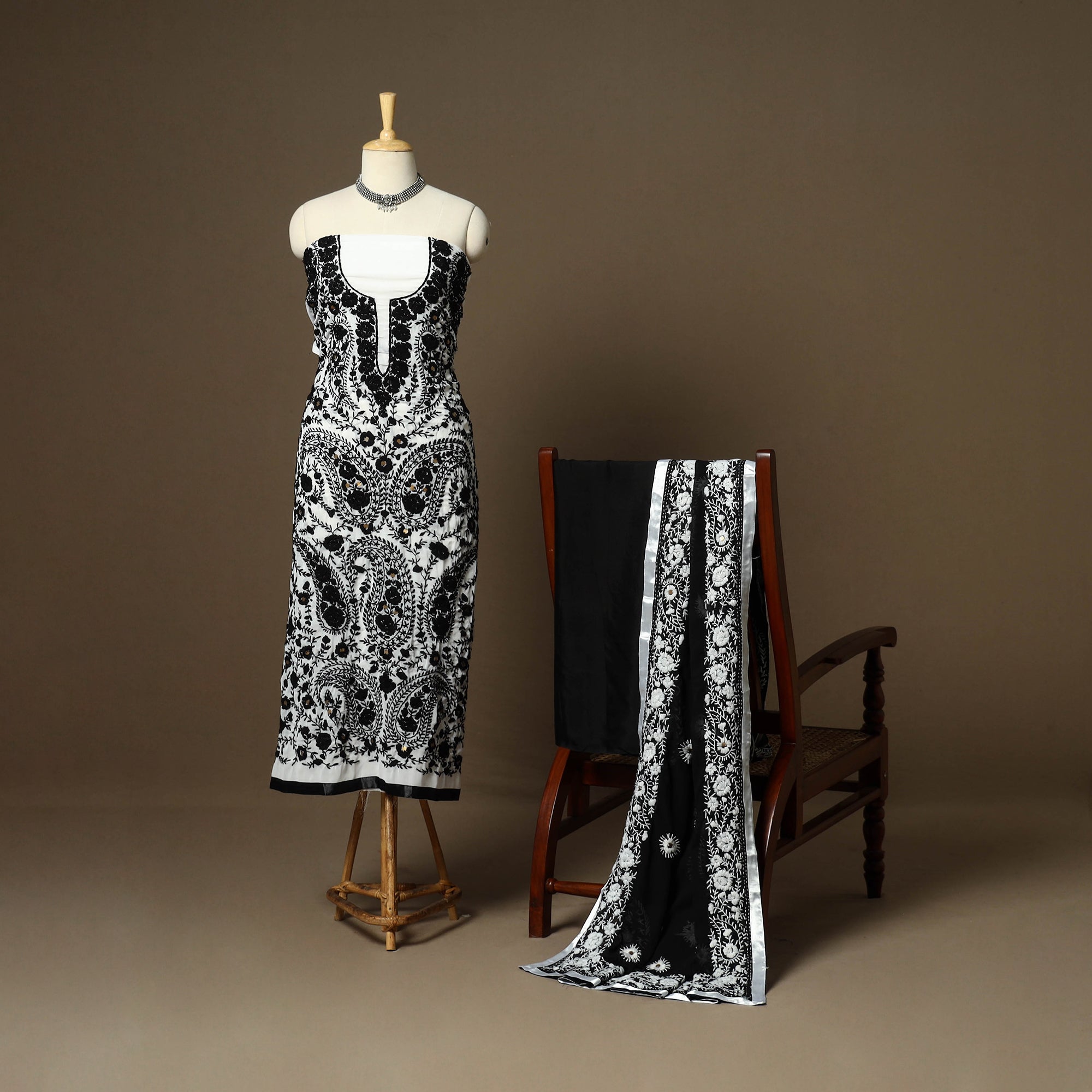 Indulge in the beauty of chapa work phulkari embroidery with this georgette 3-piece suit material set with plain santoon (viscose-cotton) bottom material. Phulkari, meaning "flower" and "kari," meaning craft, is a traditional embroidery art from Punjab, India. It uses floral motifs and is done with woolen threads. This suit material set allows you to unleash your creativity and create a unique outfit that reflects the rich tradition of Phulkari embroidery. Ideal for festive and ethnic wear.