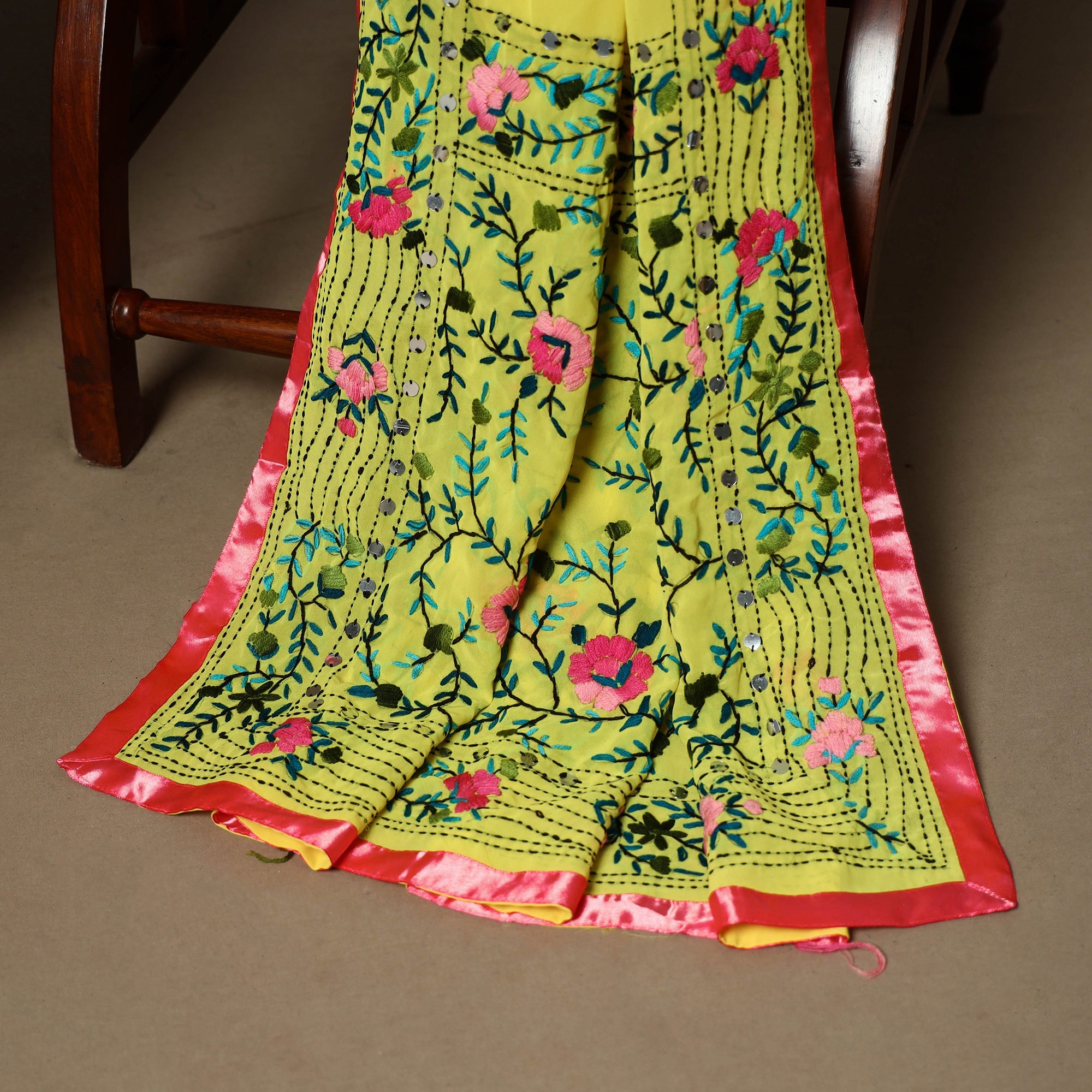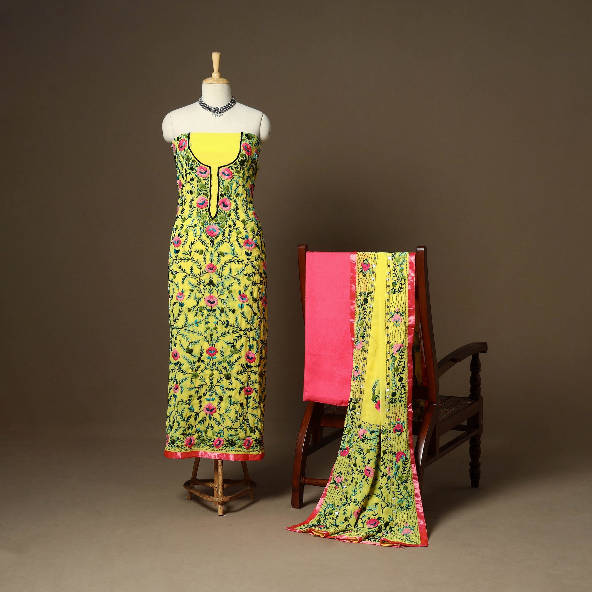 Indulge in the beauty of chapa work phulkari embroidery with this georgette 3-piece suit material set with plain santoon (viscose-cotton) bottom material. Phulkari, meaning "flower" and "kari," meaning craft, is a traditional embroidery art from Punjab, India. It uses floral motifs and is done with woolen threads. This suit material set allows you to unleash your creativity and create a unique outfit that reflects the rich tradition of Phulkari embroidery. Ideal for festive and ethnic wear.