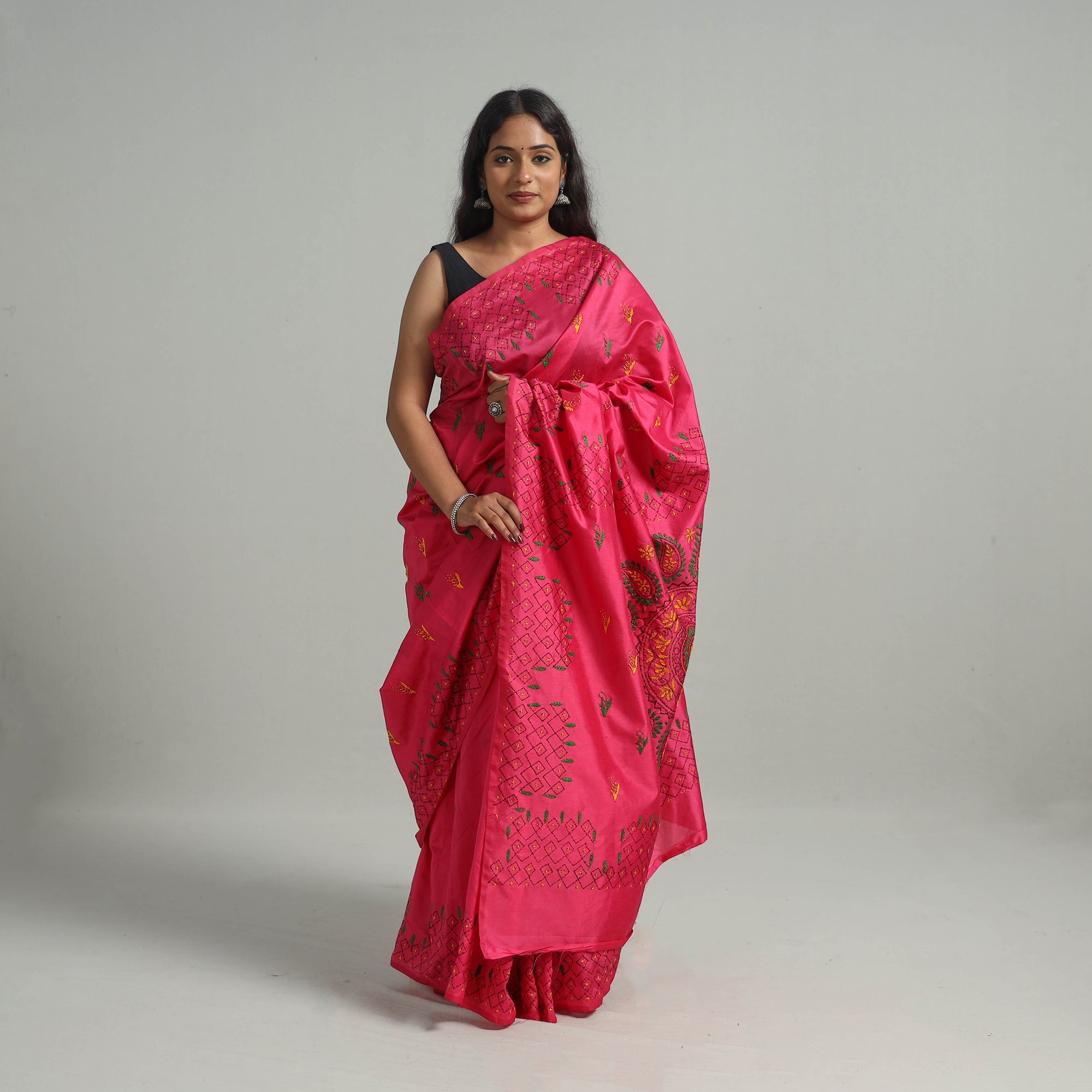 Experience the handcrafted bengal nakshi kantha embroidery with this silk saree. Each piece reflects the meticulous craftsmanship of artisans from west bengal combining intricate stitches with modern designs. This saree is perfect for those who appreciate the fusion of tradition and elegance.