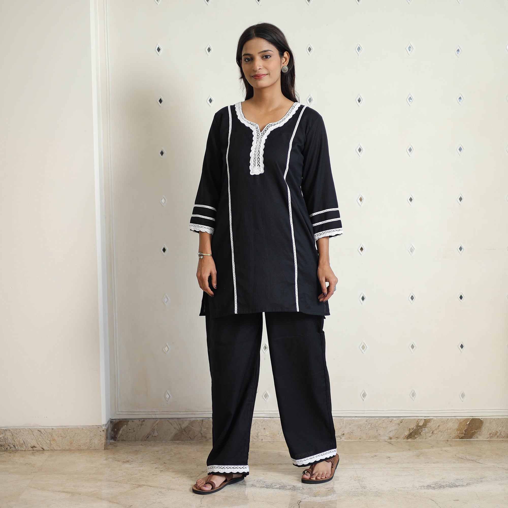 Upgrade your wardrobe with this effortlessly stylish flex cotton plain co-ord set with lace work. The top and palazzo offer both comfort and style, made from prewashed flex cotton. The elasticized waist ensures a flexible fit, while the side pockets add functionality. The unique design ensures a beautiful and comfortable fit.