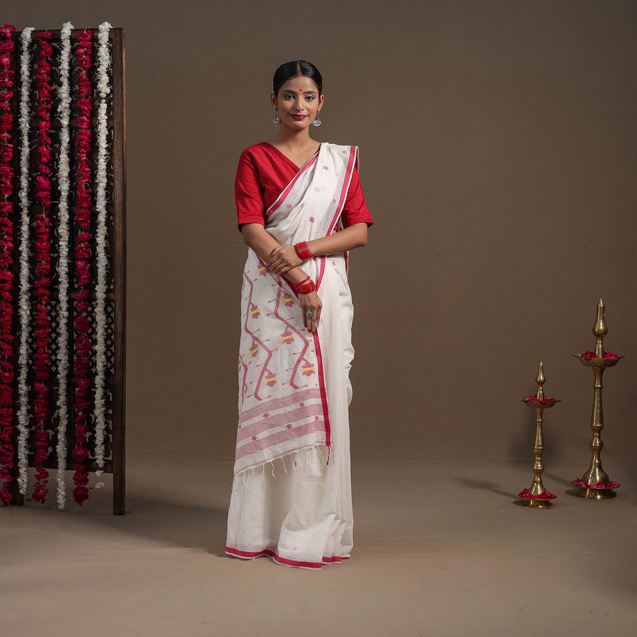 This white handloom Jamdani cotton saree from phulia, bengal is a masterpiece of traditional artistry. Jamdani sarees resemble hand embroidery on a loom, showcasing intricate, delicate patterns. A symbol of Bengal rich cultural heritage, each piece is crafted with care, using pure cotton. This saree embodies elegance.