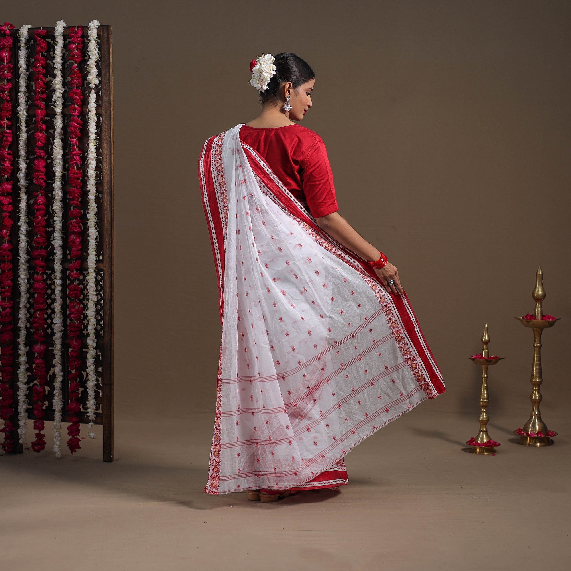 This white phulia jamdani handloom cotton saree features intricate a technique unique to Bengal. Handcrafted by skilled artisans tradition of Jamdani, which is like embroidery done directly on the loom. Woven with delicate care and adorned with a velvet border, this saree brings the beauty of Bengal’s rich cultural heritage to your wardrobe. Perfect for those who love traditional sustainable fashion.