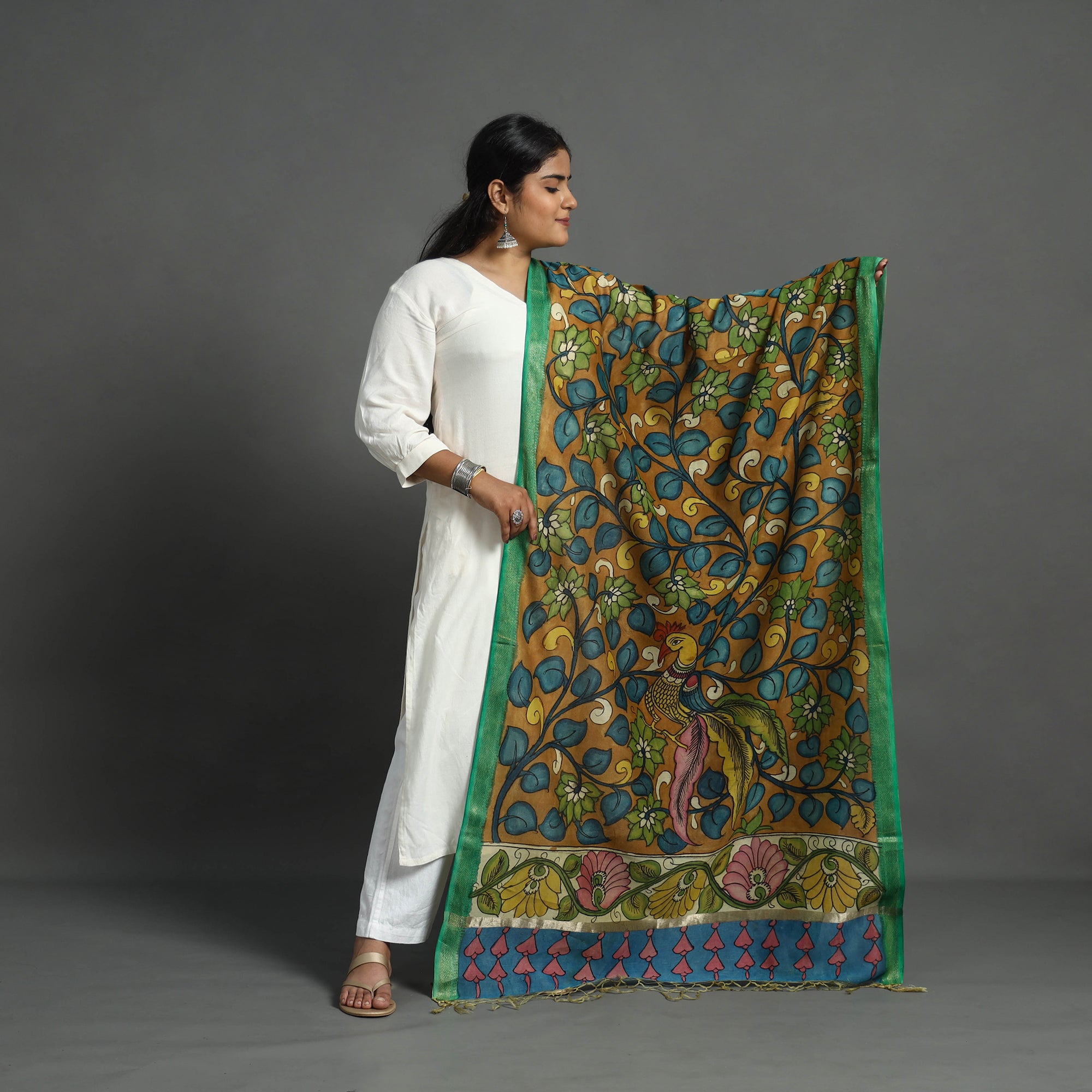 This exquisite brown srikalahasti pen kalamkari dupatta is a true masterpiece, entirely handpainted by skilled artisans using natural dyes. Made of chanderi silk cotton fabric with a delicate zari border and tassels, perfect for any festive occasion. This dupatta is created with srikalahasti style of kalamkari, wherein the "kalam" or pen is used for free hand drawing of the subject and filling in the colours.
