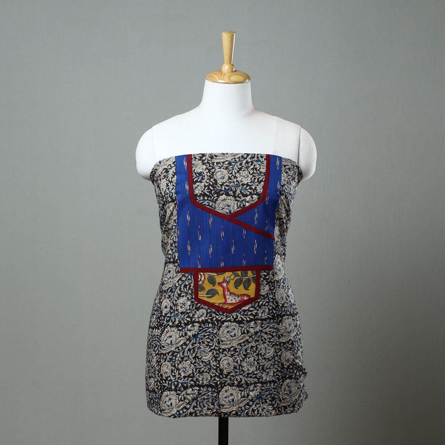 Crafted with black kalamkari block printing techniques, this kalamkari cotton kurta material with patchwork is a perfect blend of tradition and style. crafted by artisans, the vibrant colors and designs reflect the rich cultural heritage of Kalamkari. This is ideal for creating kurtas that are both stylish and timeless.