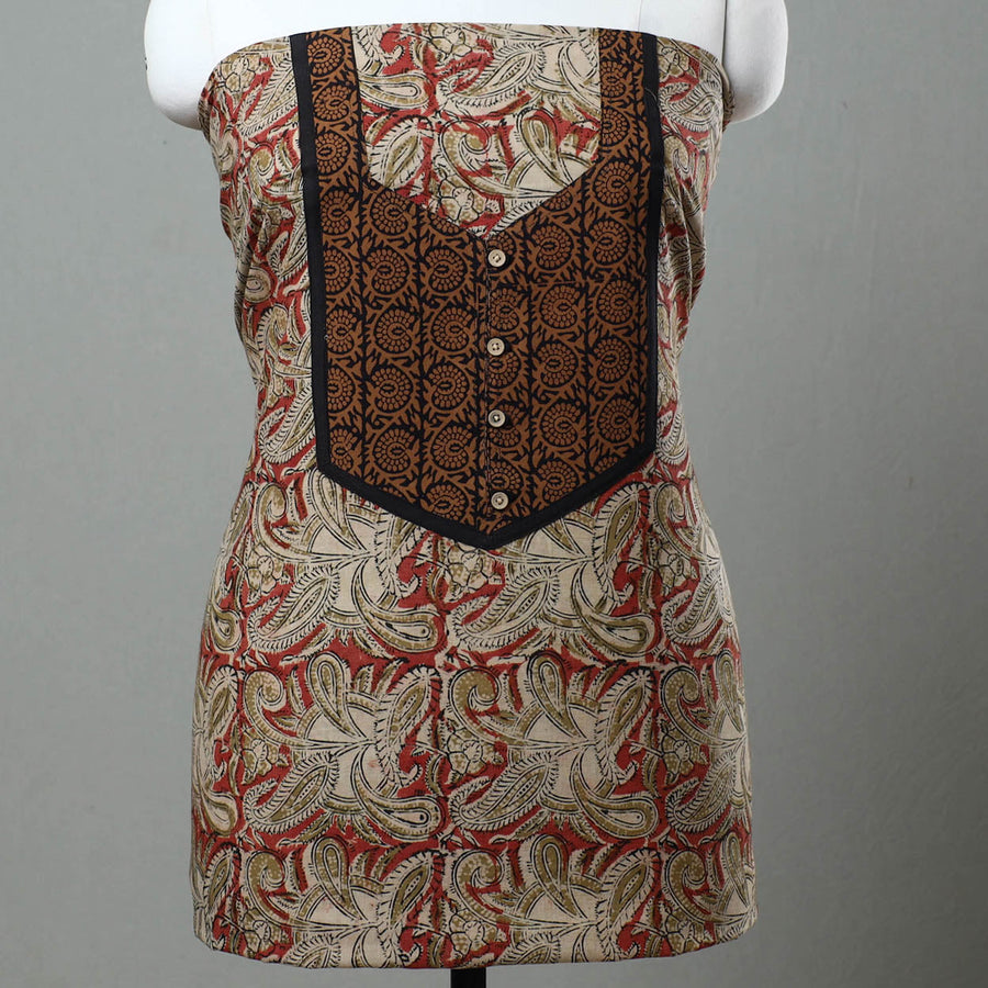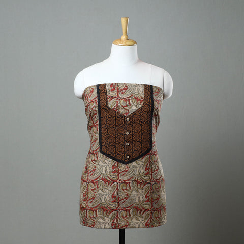 Crafted with red kalamkari block printing techniques, this kalamkari cotton kurta material with patchwork is a perfect blend of tradition and style. crafted by artisans, the vibrant colors and designs reflect the rich cultural heritage of Kalamkari. This is ideal for creating kurtas that are both stylish and timeless.