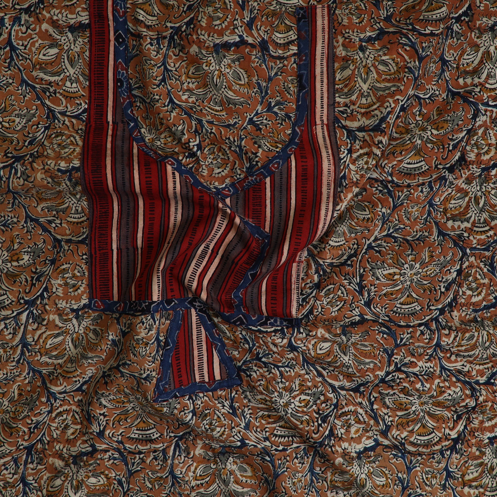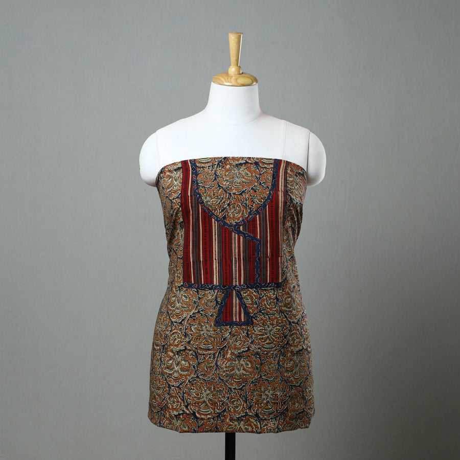 Crafted with orange kalamkari block printing techniques, this kalamkari cotton kurta material with patchwork is a perfect blend of tradition and style. crafted by artisans, the vibrant colors and designs reflect the rich cultural heritage of Kalamkari. This is ideal for creating kurtas that are both stylish and timeless.