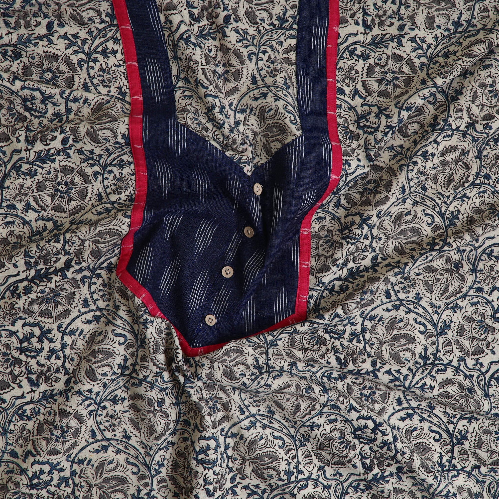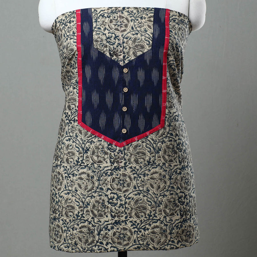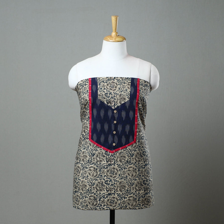 Crafted with beige kalamkari block printing techniques, this kalamkari cotton kurta material with patchwork is a perfect blend of tradition and style. crafted by artisans, the vibrant colors and designs reflect the rich cultural heritage of Kalamkari. This is ideal for creating kurtas that are both stylish and timeless.