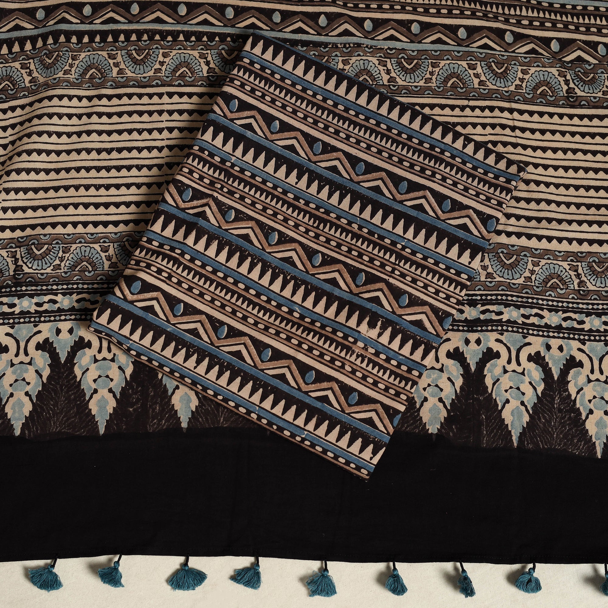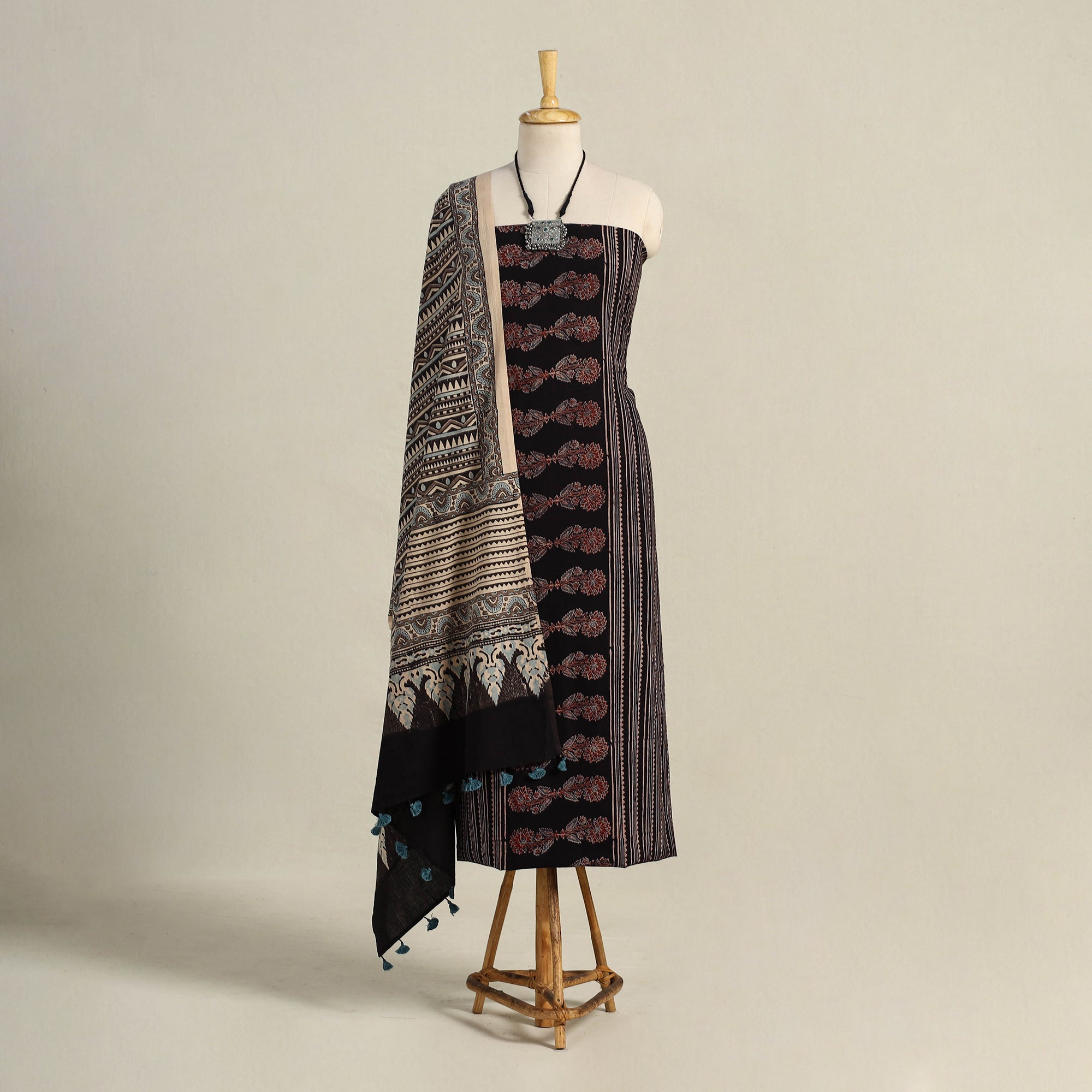 Elevate your wardrobe with this black hand-block printed cotton 3pc ajrakh dress material set, made with by artisans from Kutch, Gujarat. The ajrakh technique uses natural dyes, creating intricate patterns that reflect India’s rich textile heritage. this suit material is perfect for festive occasions or daily wear.