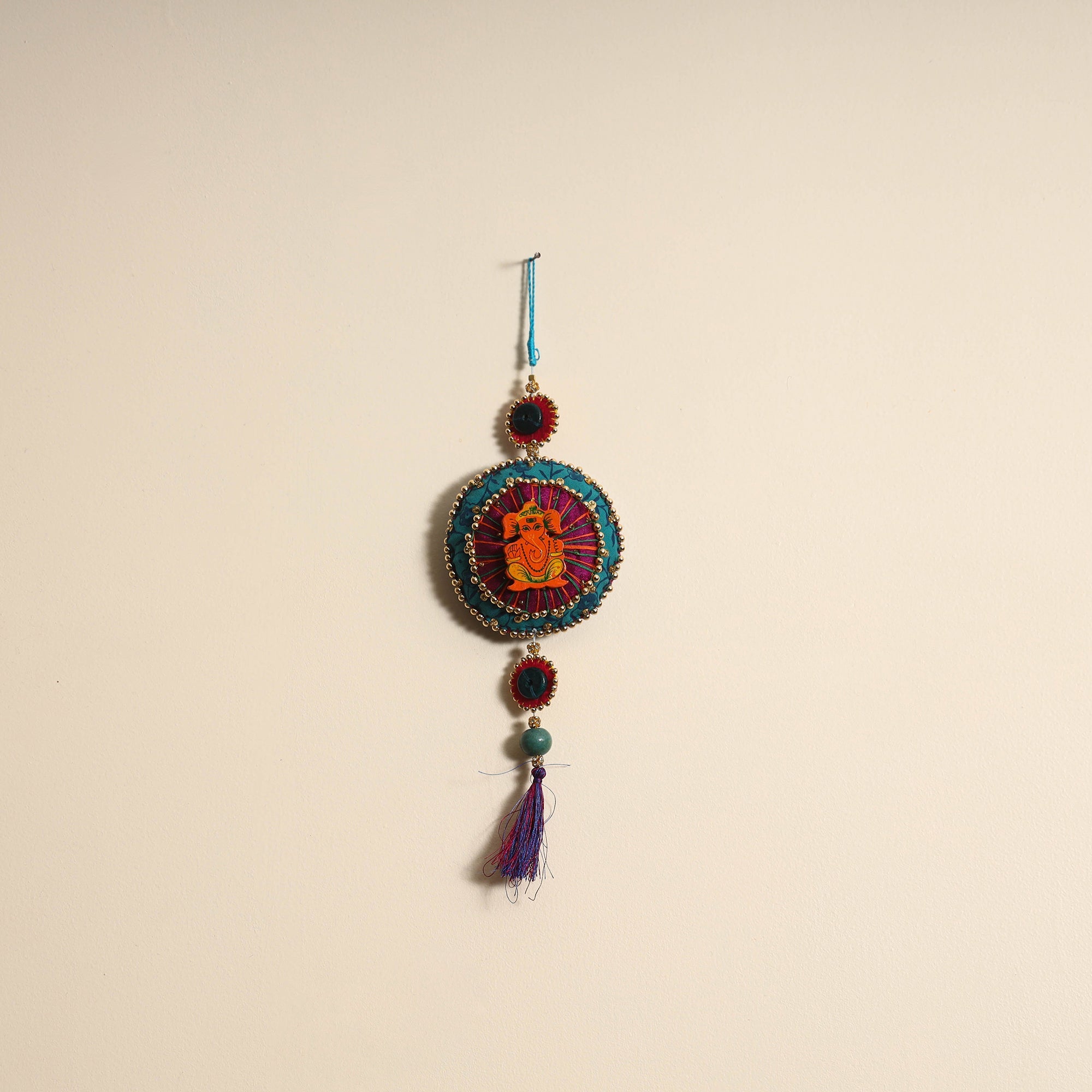 | Material | This handmade felt and beadwork wall hanging is the perfect addition to your diwali or festive decor. Crafted by skilled artisans using fabric, felt, beads, and wood, it brings traditional charm and blessings to your home. Its unique design adds a touch of elegance and cultural richness to any space. |