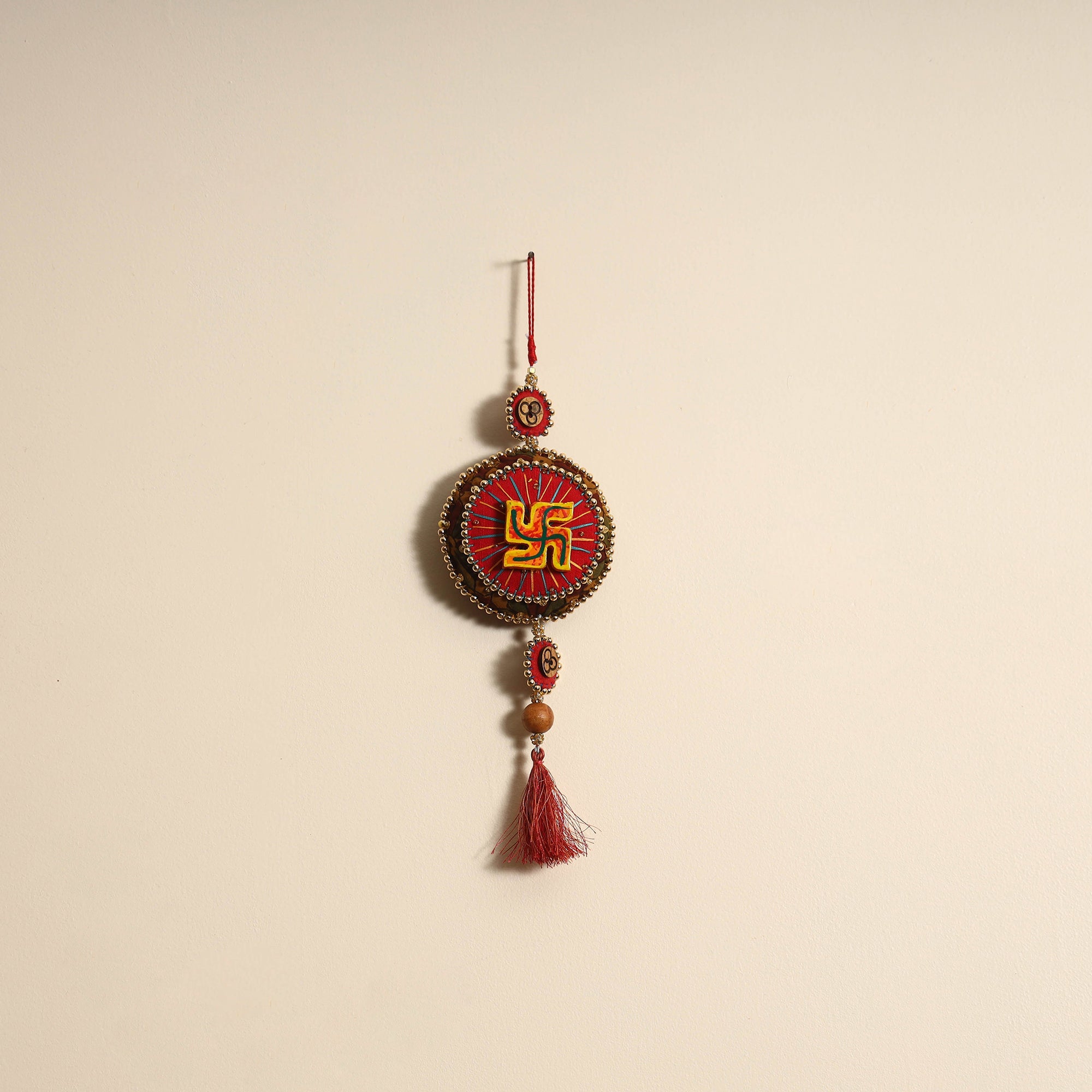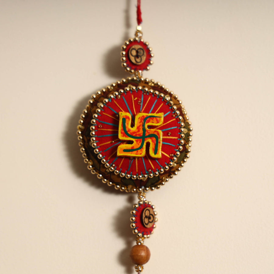 | Material | This handmade felt and beadwork wall hanging is the perfect addition to your diwali or festive decor. Crafted by skilled artisans using fabric, felt, beads, and wood, it brings traditional charm and blessings to your home. Its unique design adds a touch of elegance and cultural richness to any space. |