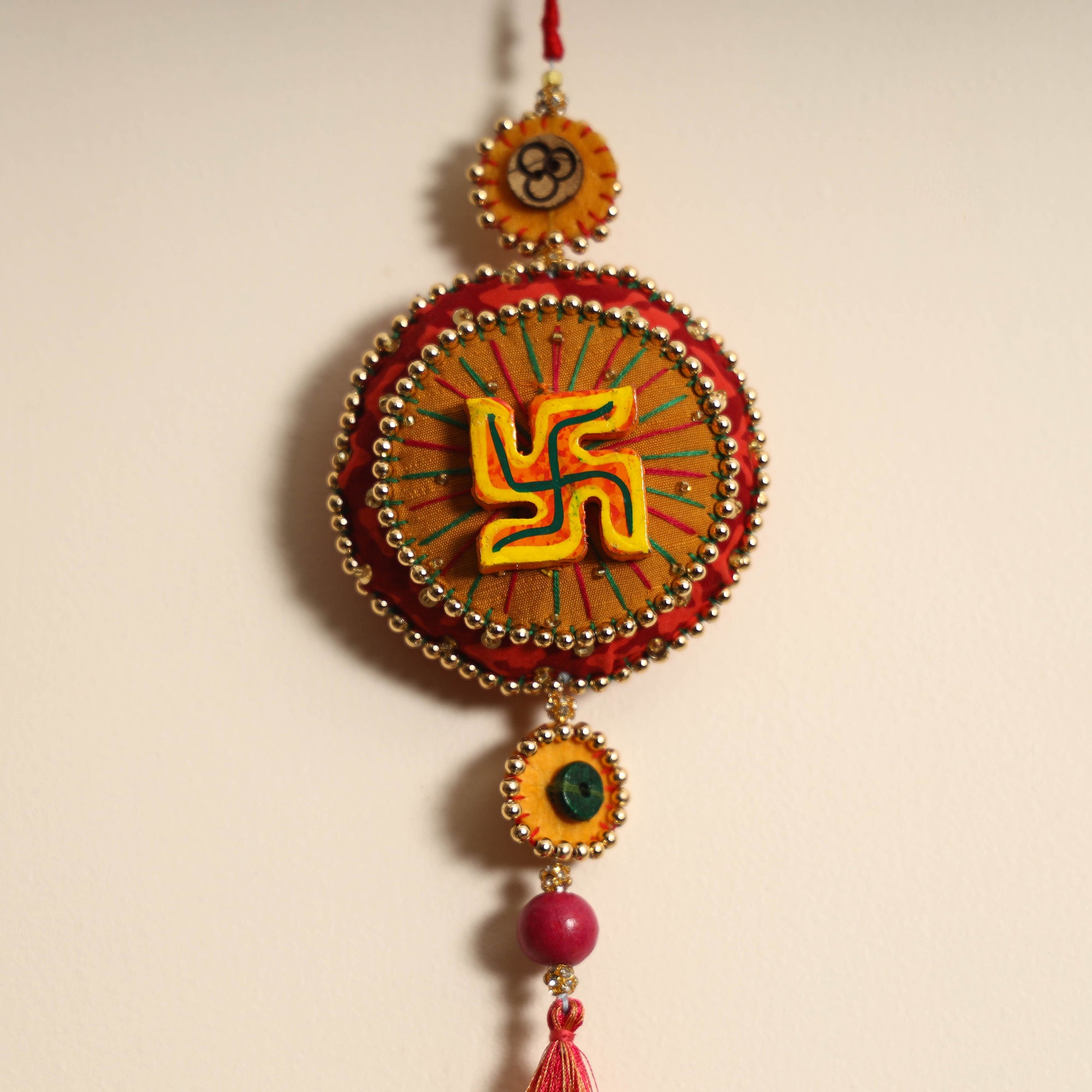 | Material | This handmade felt and beadwork wall hanging is the perfect addition to your diwali or festive decor. Crafted by skilled artisans using fabric, felt, beads, and wood, it brings traditional charm and blessings to your home. Its unique design adds a touch of elegance and cultural richness to any space. |