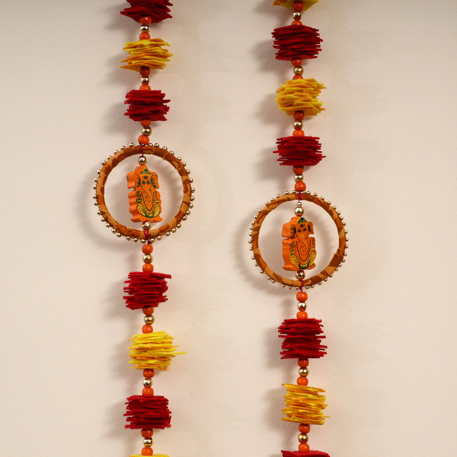 | Material | This handmade felt and beadwork wall hanging (set of 2) is the perfect addition to your diwali or festive decor. Crafted by skilled artisans using felt, beads, and wood, it brings traditional charm and blessings to your home. Its unique design adds a touch of elegance and cultural richness to any space. |