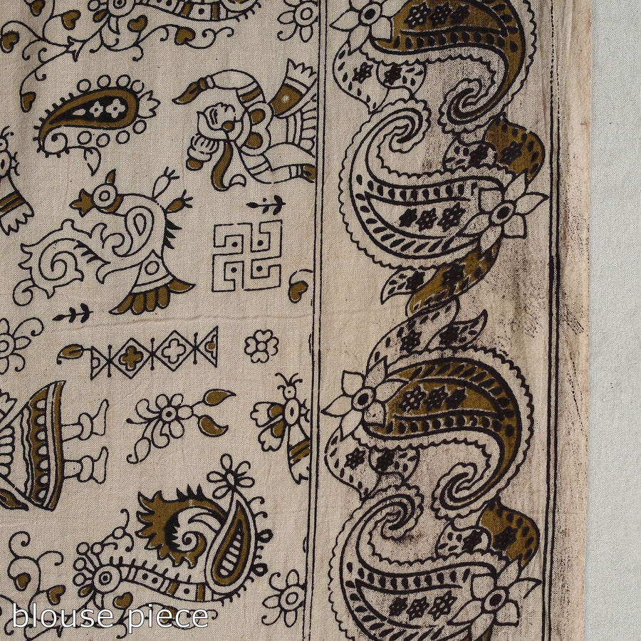 Fine-quality kalamkari screen-printed pure cotton saree with blouse piece. This saree is made from pure cotton. It features intricate screen-printed designs inspired by traditional Kalamkari painting. The saree comes with a matching blouse piece. Each piece is eco-friendly, supporting skilled artisans who continue this ancient craft.