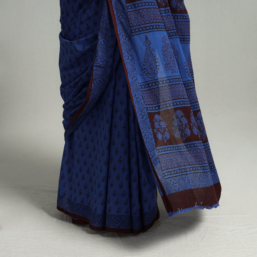 The stunning blue bagh prints add artistry to your ensemble. A very light weight cotton saree for your wardrobe. The designs and patterns are made using the traditional technique of block printing and natural dyes. Wear it to work, meetings or a lunch. Pair with juttis or sandals and silver earrings for a complete and stylish look. This saree offers a delightful blend of comfort and style.
