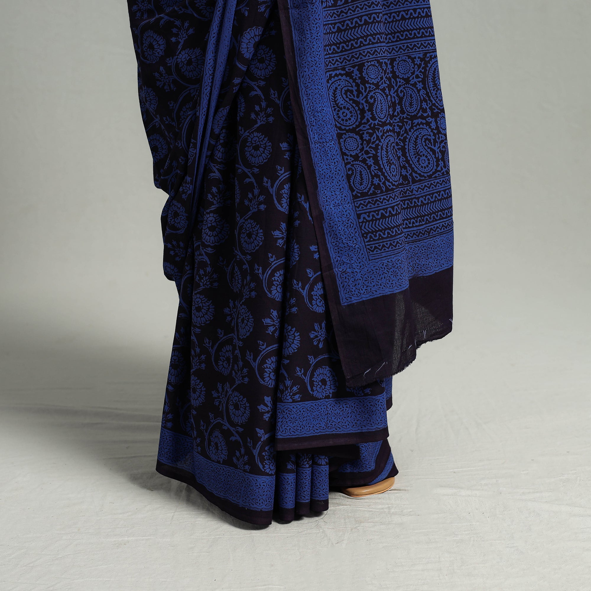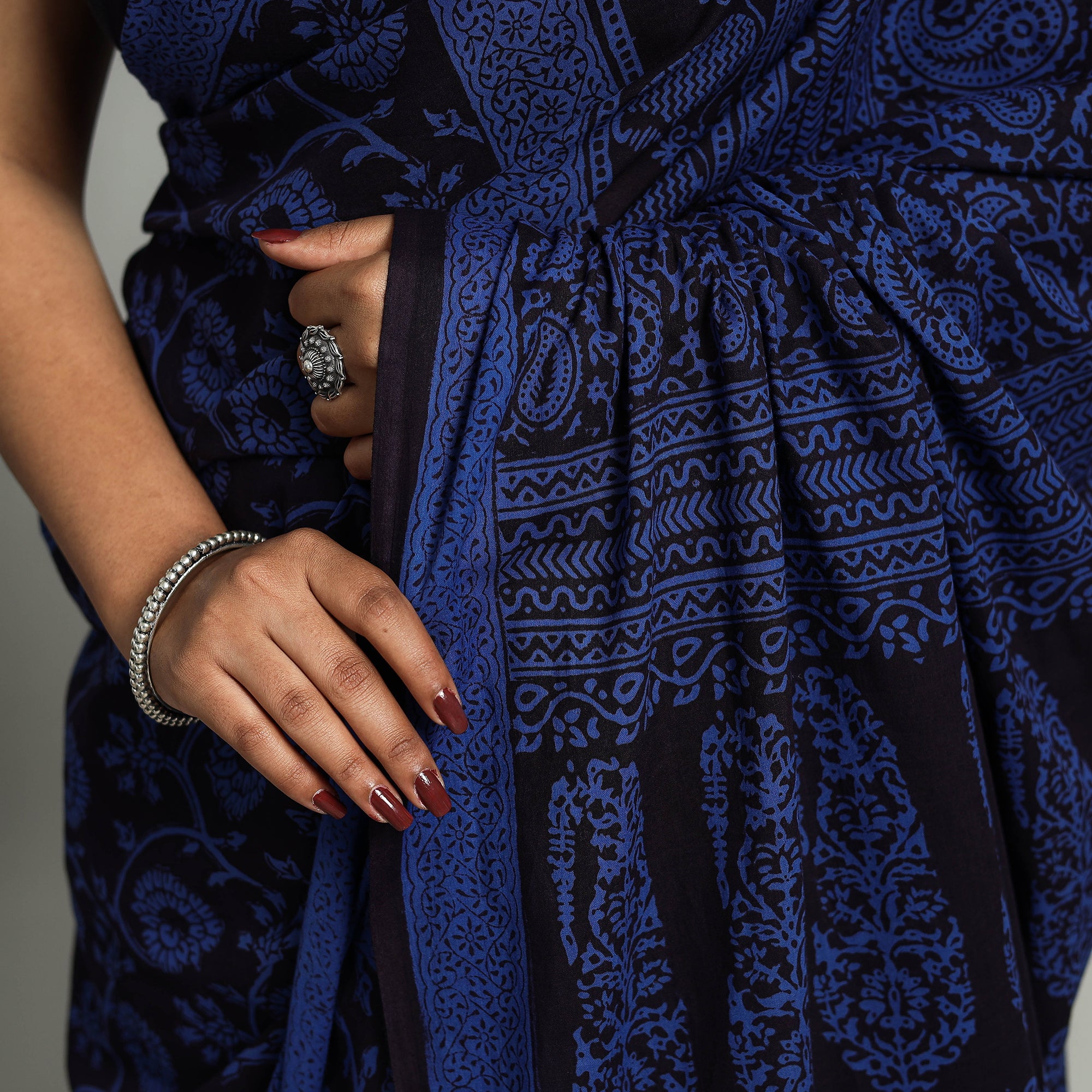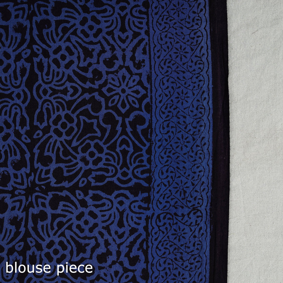 The stunning blue bagh prints add artistry to your ensemble. A very light weight cotton saree for your wardrobe. The designs and patterns are made using the traditional technique of block printing and natural dyes. Wear it to work, meetings or a lunch. Pair with juttis or sandals and silver earrings for a complete and stylish look. This saree offers a delightful blend of comfort and style.