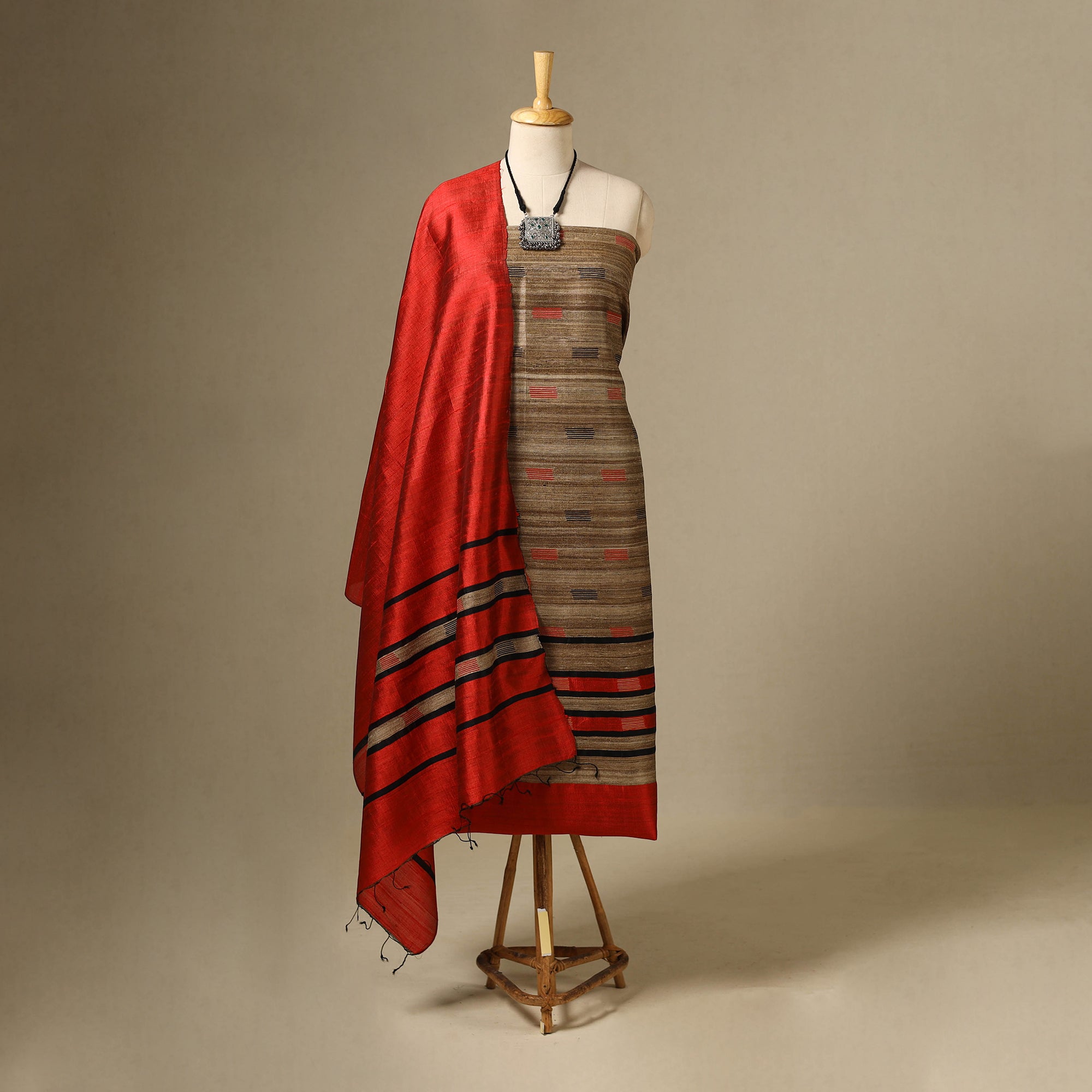 Embrace the beauty of brown handloom and sustainable fashion with this stunning Bhagalpuri tussar silk dress material. Renowned for its rich texture, subtle sheen, and natural feel. Perfect for formal and occasional wear. Make a lasting impression with this elegant choice.
