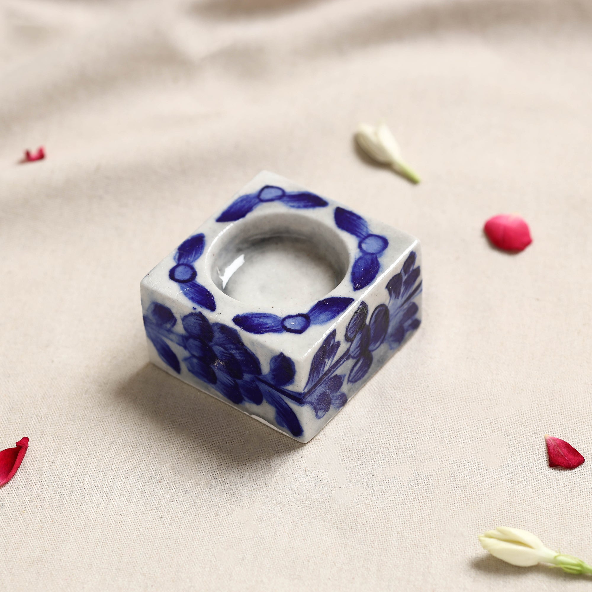 Elevate your space with this grey blue pottery ceramic tealight candle holder handmade by skilled artisans from rajasthan. A reflection of India rich pottery heritage this candle holder brings culture to any setting, whether for a festive gathering or a cozy night in. Each piece is crafted with natural dyes and features intricate designs.