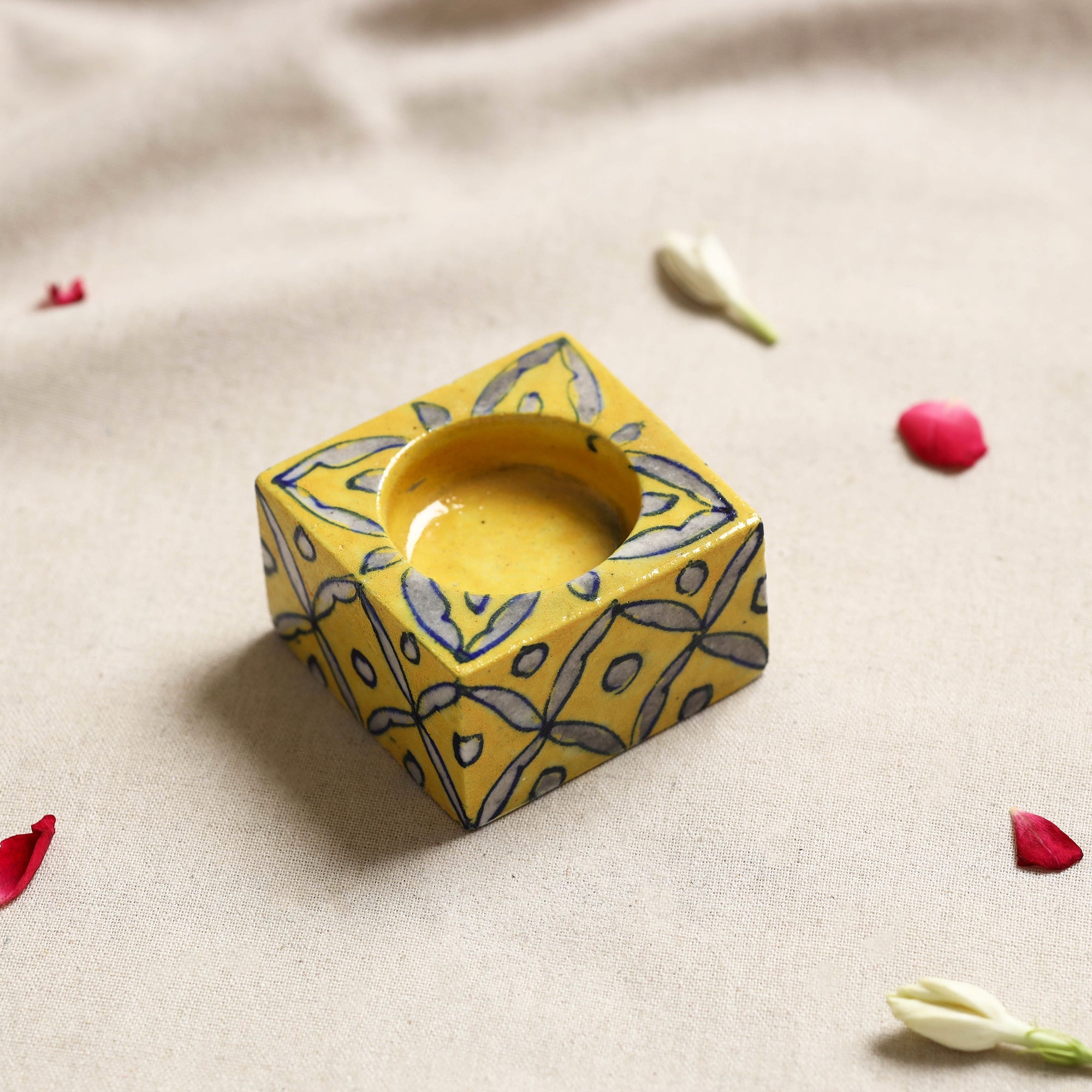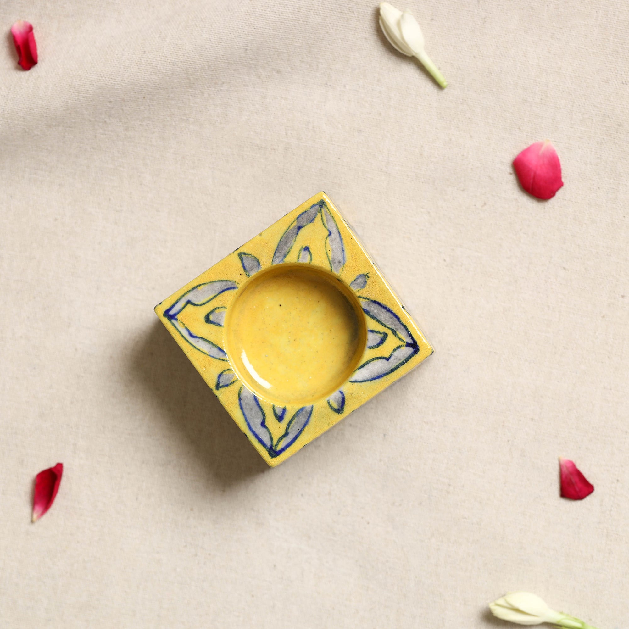Elevate your space with this yellow blue pottery ceramic tealight candle holder handmade by skilled artisans from rajasthan. A reflection of India rich pottery heritage this candle holder brings culture to any setting, whether for a festive gathering or a cozy night in. Each piece is crafted with natural dyes and features intricate designs.