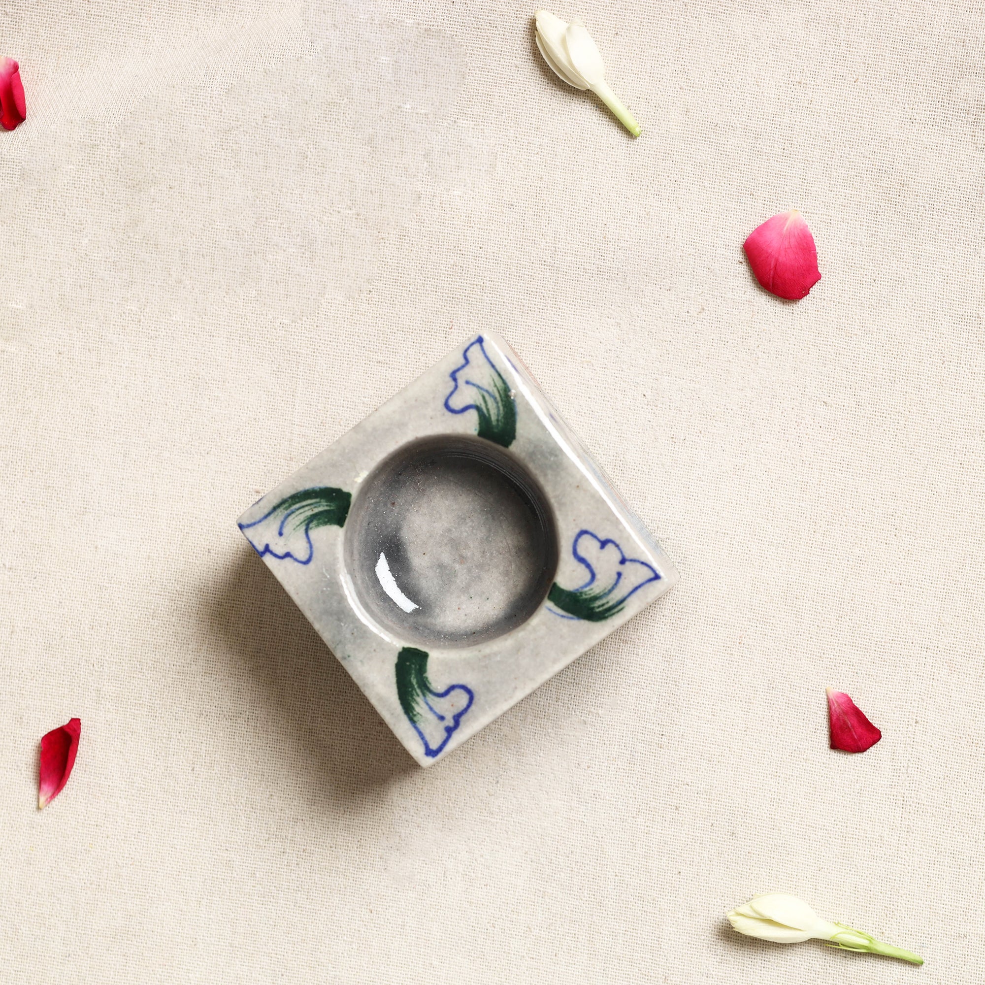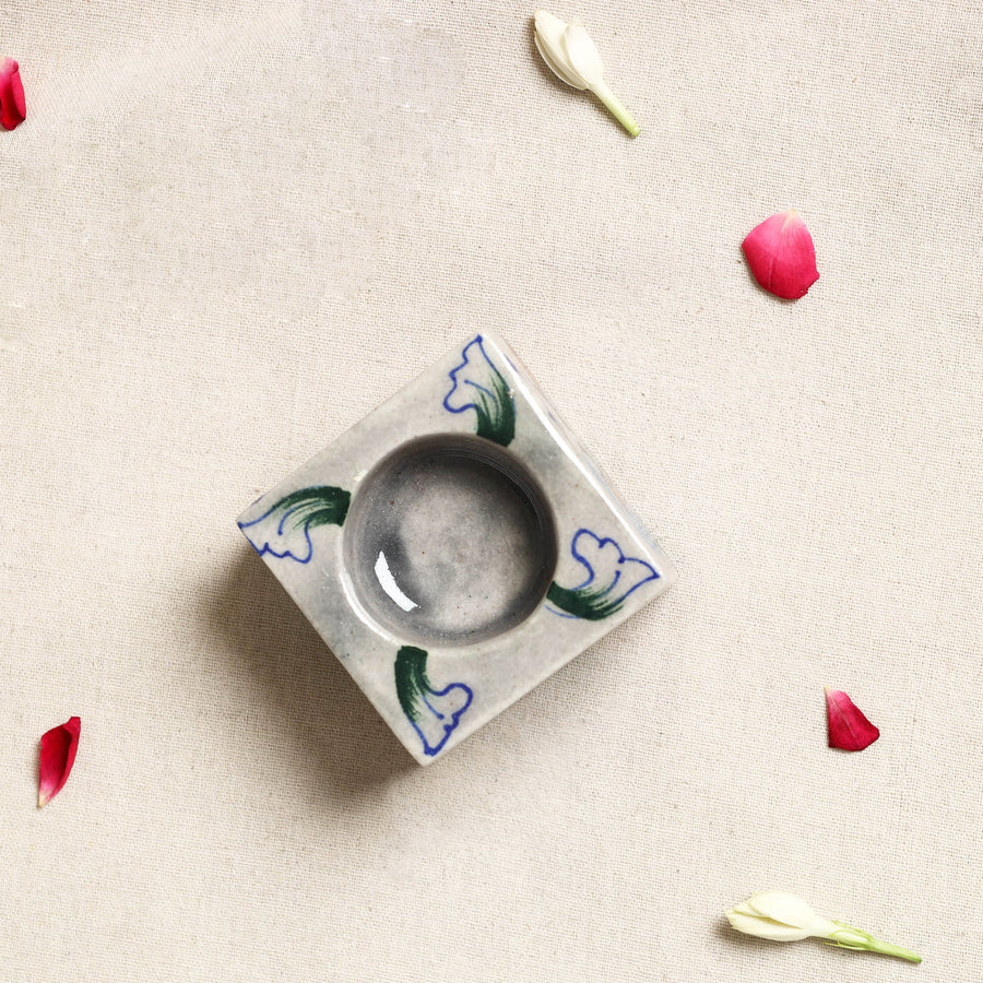 Elevate your space with this grey blue pottery ceramic tealight candle holder handmade by skilled artisans from rajasthan. A reflection of India rich pottery heritage this candle holder brings culture to any setting, whether for a festive gathering or a cozy night in. Each piece is crafted with natural dyes and features intricate designs.