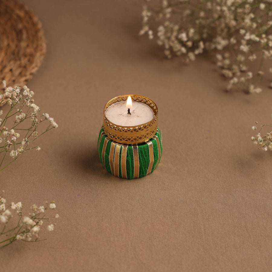 Illuminate your space with our handmade tealight candle holder, a stunning blend of tradition and artistry. Crafted with intricate gota work, this damru designed holder brings vibrant colors and cultural charm to any setting. Perfect for special festival & occasions, it adds a unique touch to your decor.